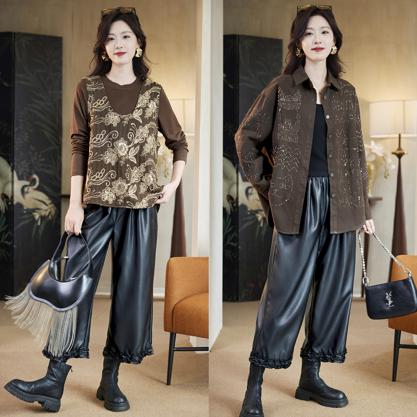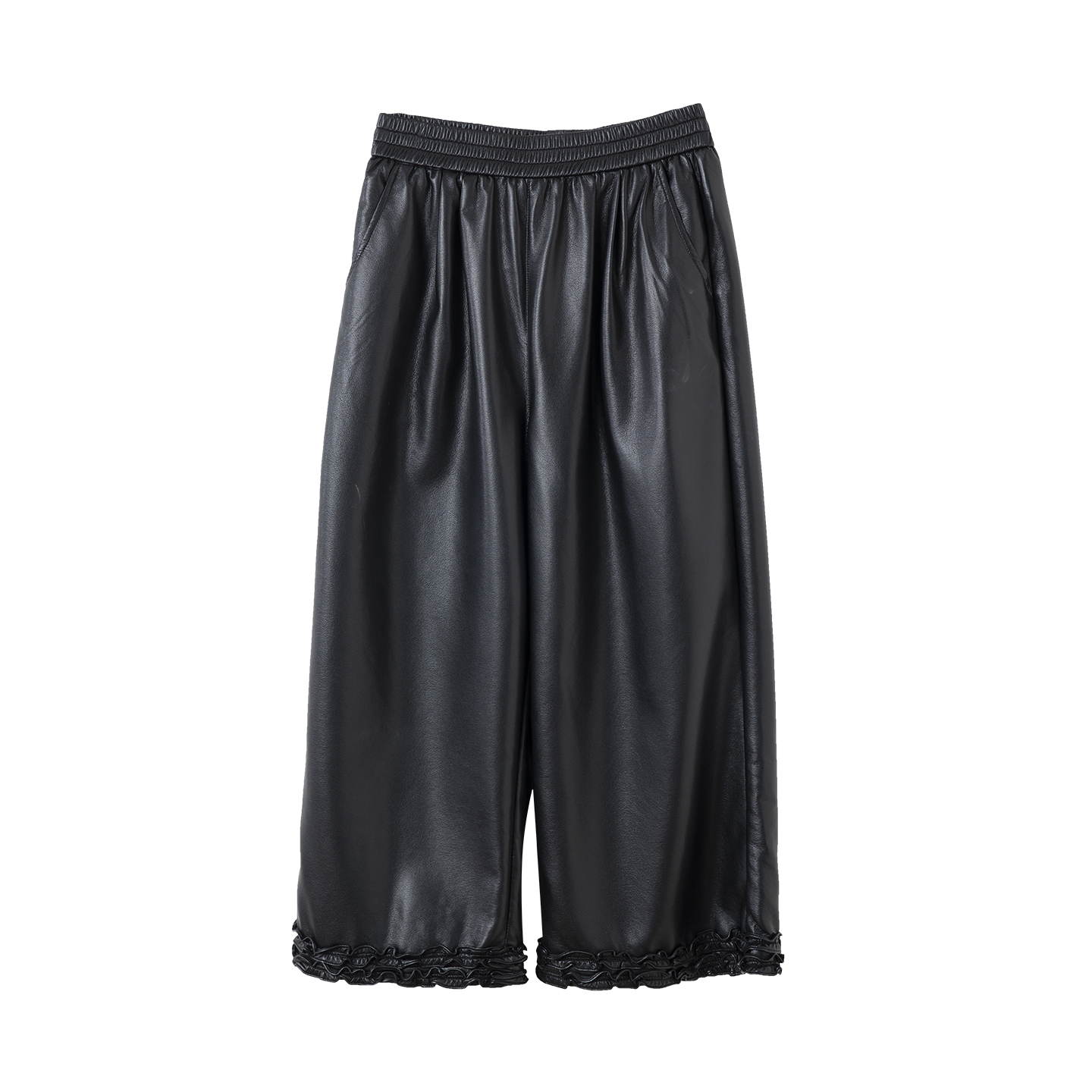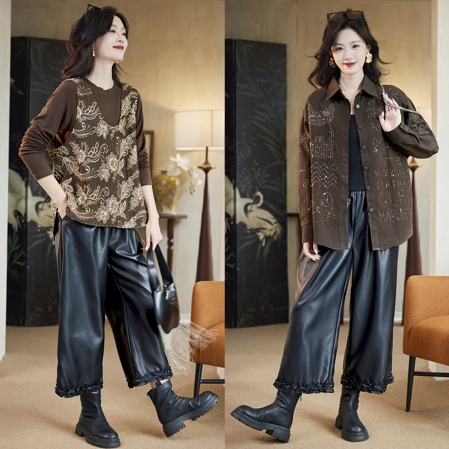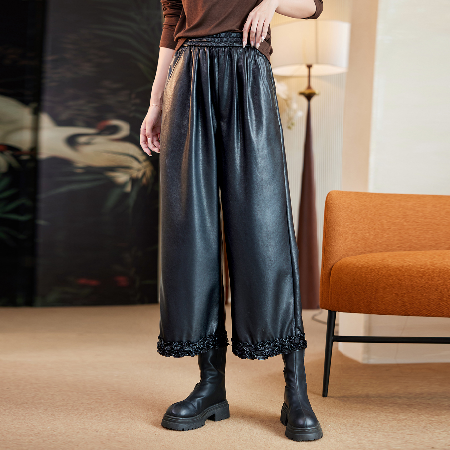 宝诗黎高腰阔腿皮质休闲裤女2025秋季时尚气质宽松百搭九分直筒裤