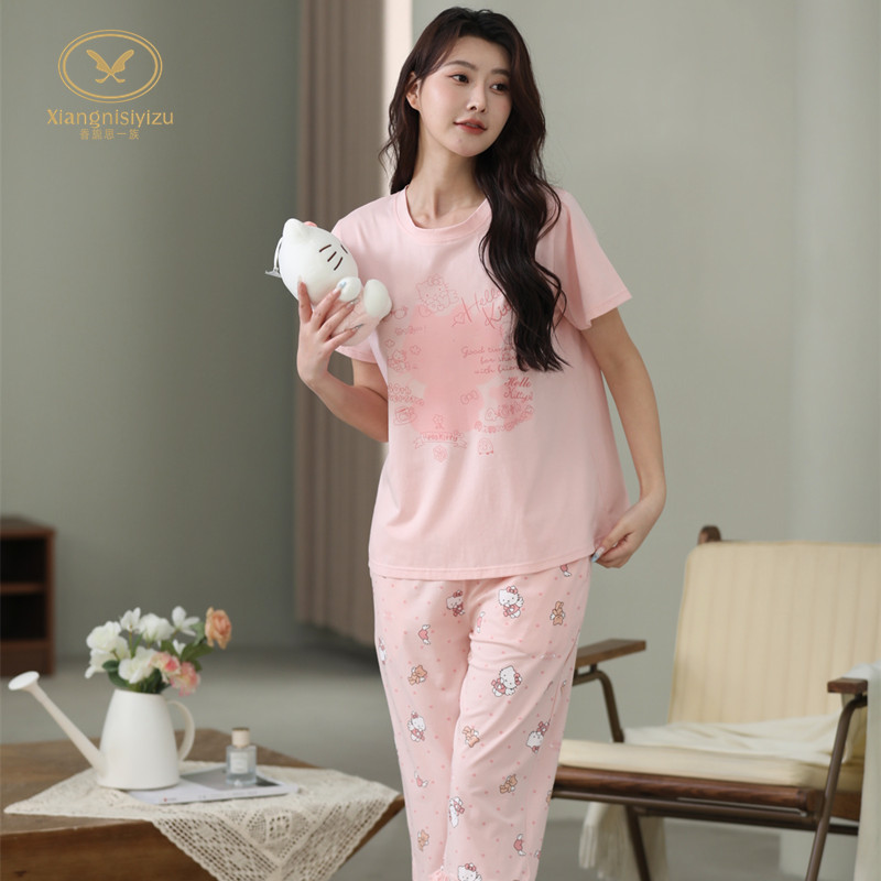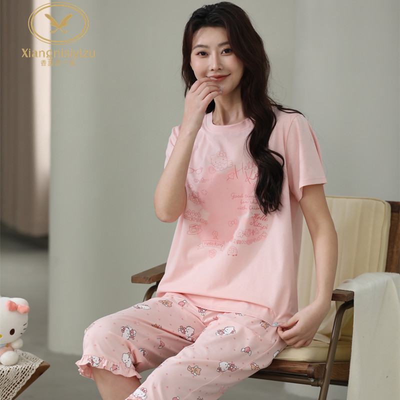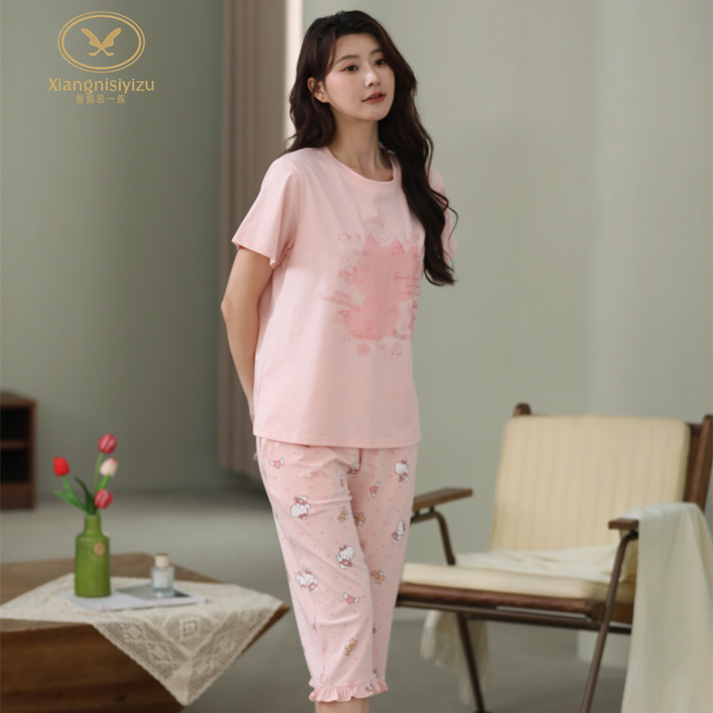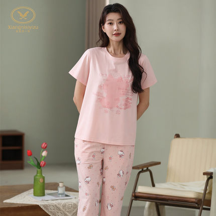 香旎思一族女士夏二件套圆领套头短袖七分裤舒适甜美在家穿家居服