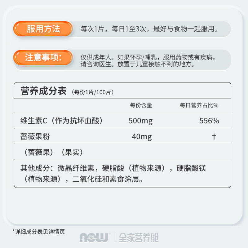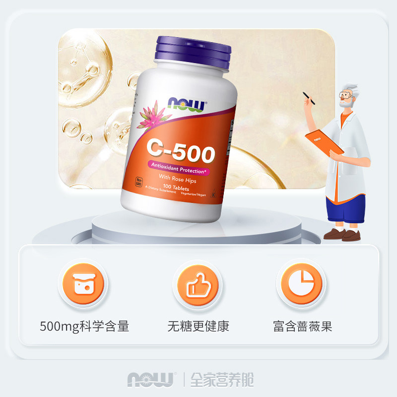 NOWfoods维生素C500mg维他命VC复合玫瑰果100片诺奥成人正品进口