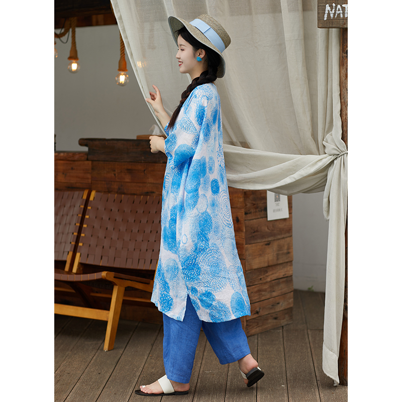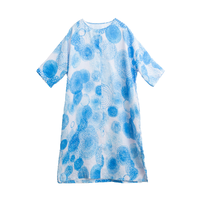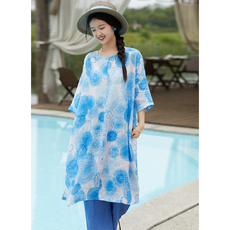 忘城A964座/蓝天白云/夏季新款海边度假21支亚麻蓝色印花连衣裙女