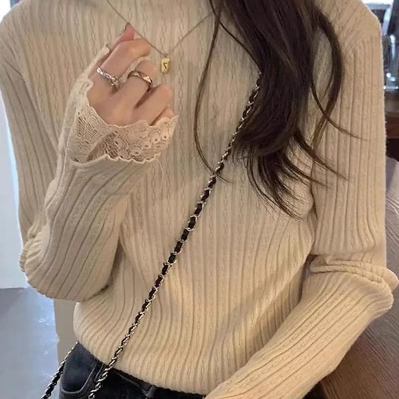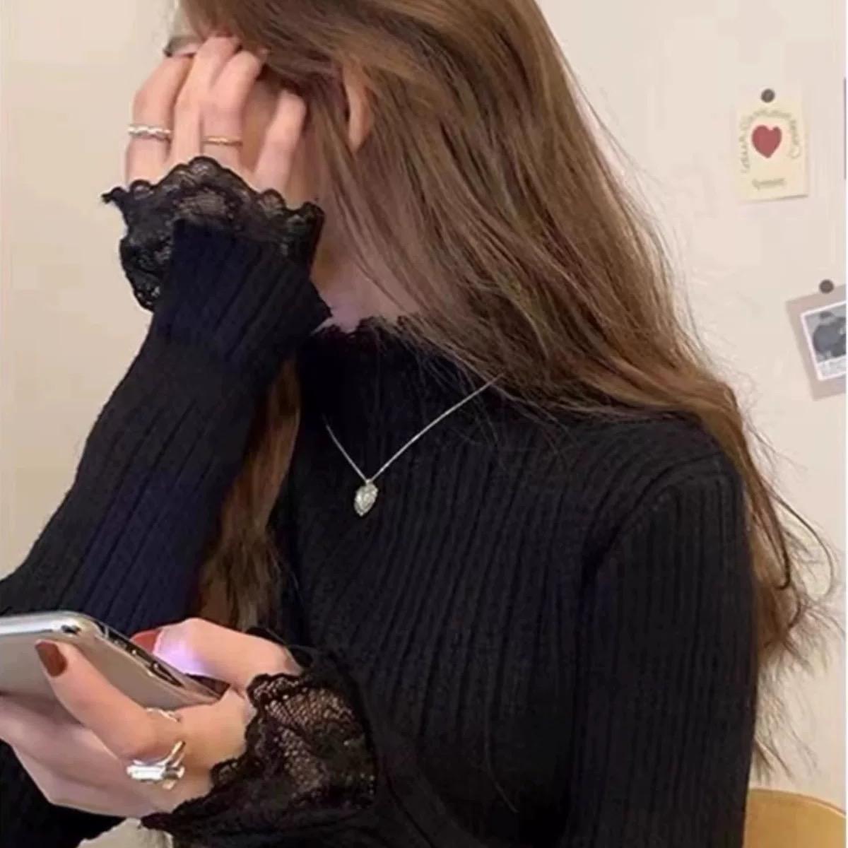 大码胖妹妹蕾丝花边打底针织衫女秋冬内搭半高领修身毛衣长袖上衣