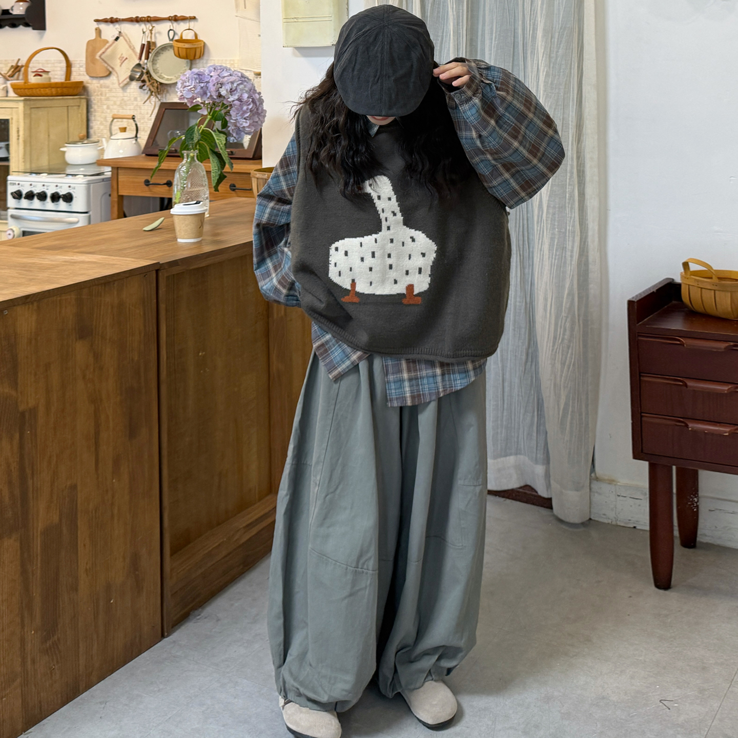 大码女装2025秋新款胖mm韩版宽松格子衬衫+叠穿针织马甲+裤子套装