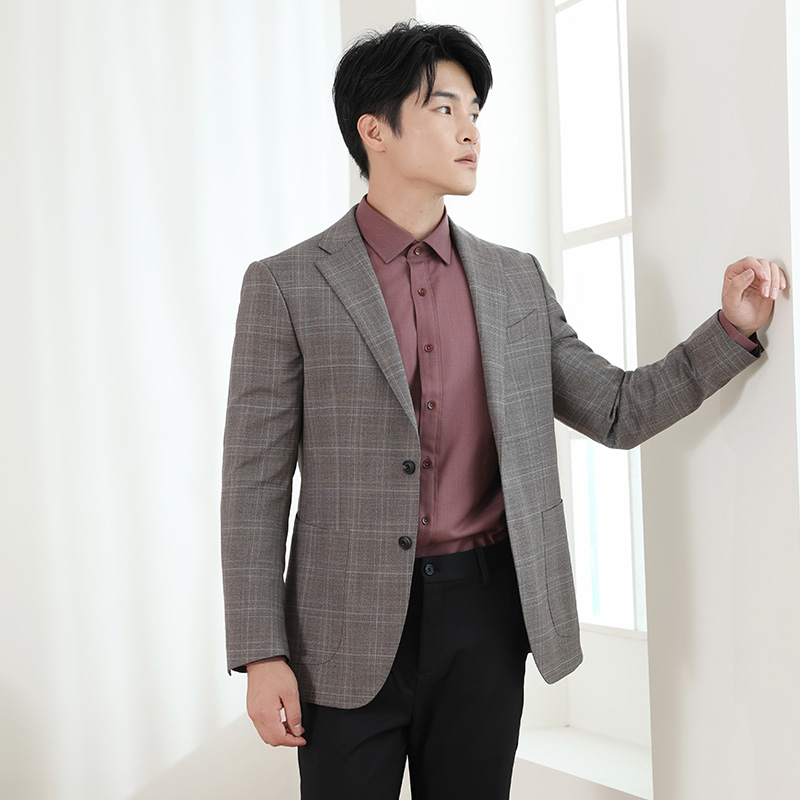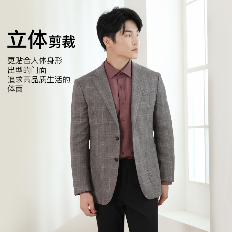 乔治白男士西服含羊毛商务休闲咖色格纹平驳领西装外套通勤简约
