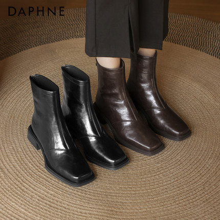 达芙妮短靴女方头瘦瘦靴粗跟平底