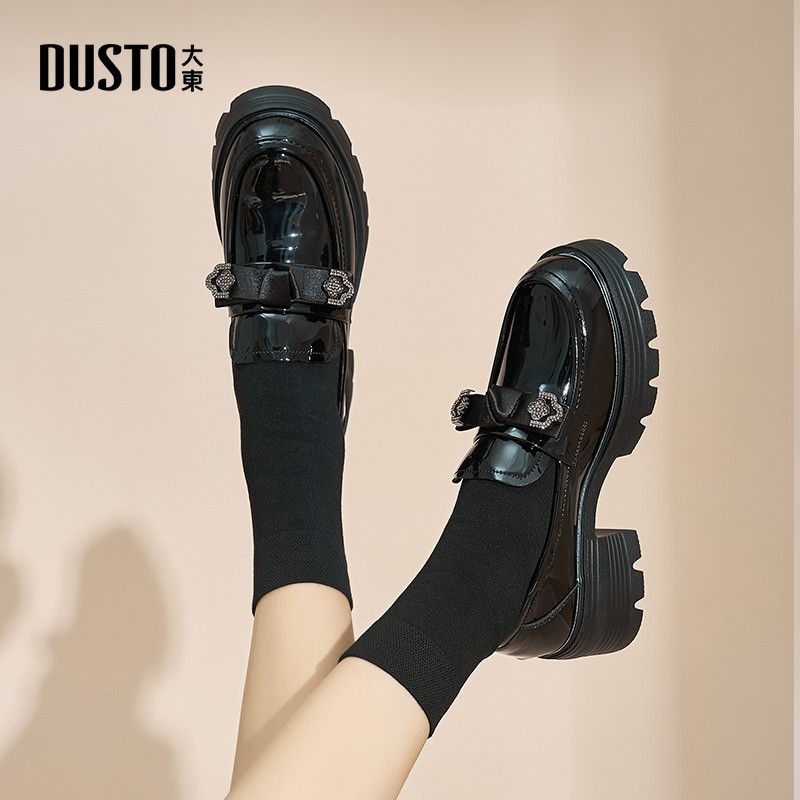 大东黑色英伦风小皮鞋女2025新款秋冬女鞋圆头宽头厚底漆皮乐福鞋