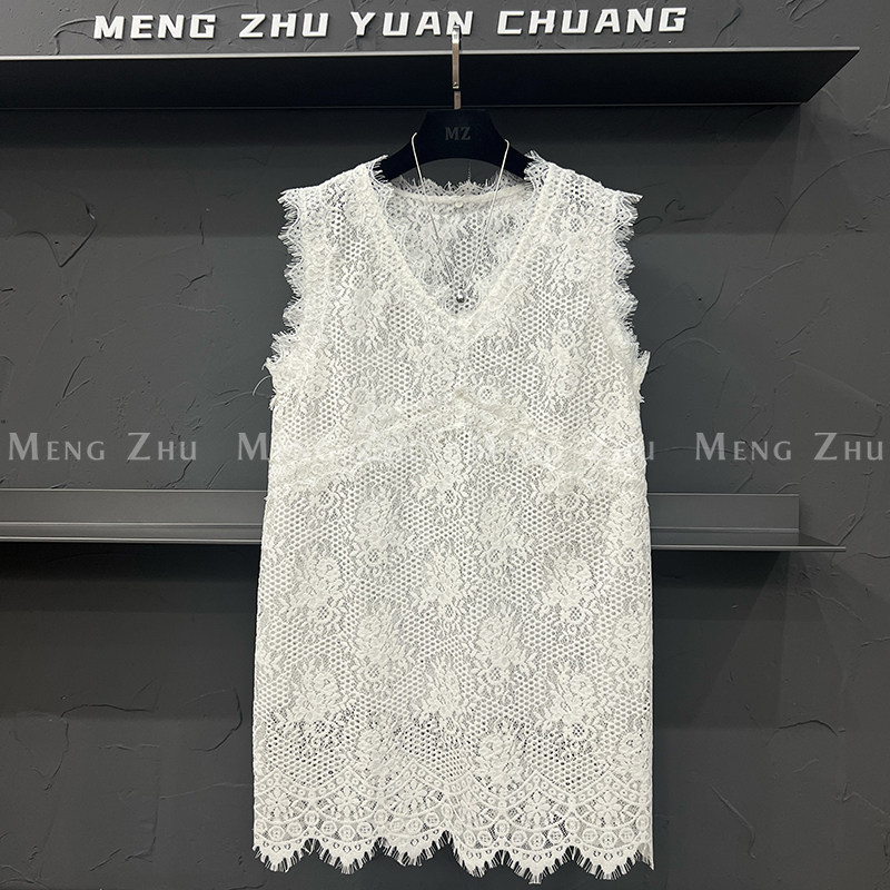 高端欧货新款高级感巨好看的V领钩花镂空蕾丝拼接背心连衣裙女秋