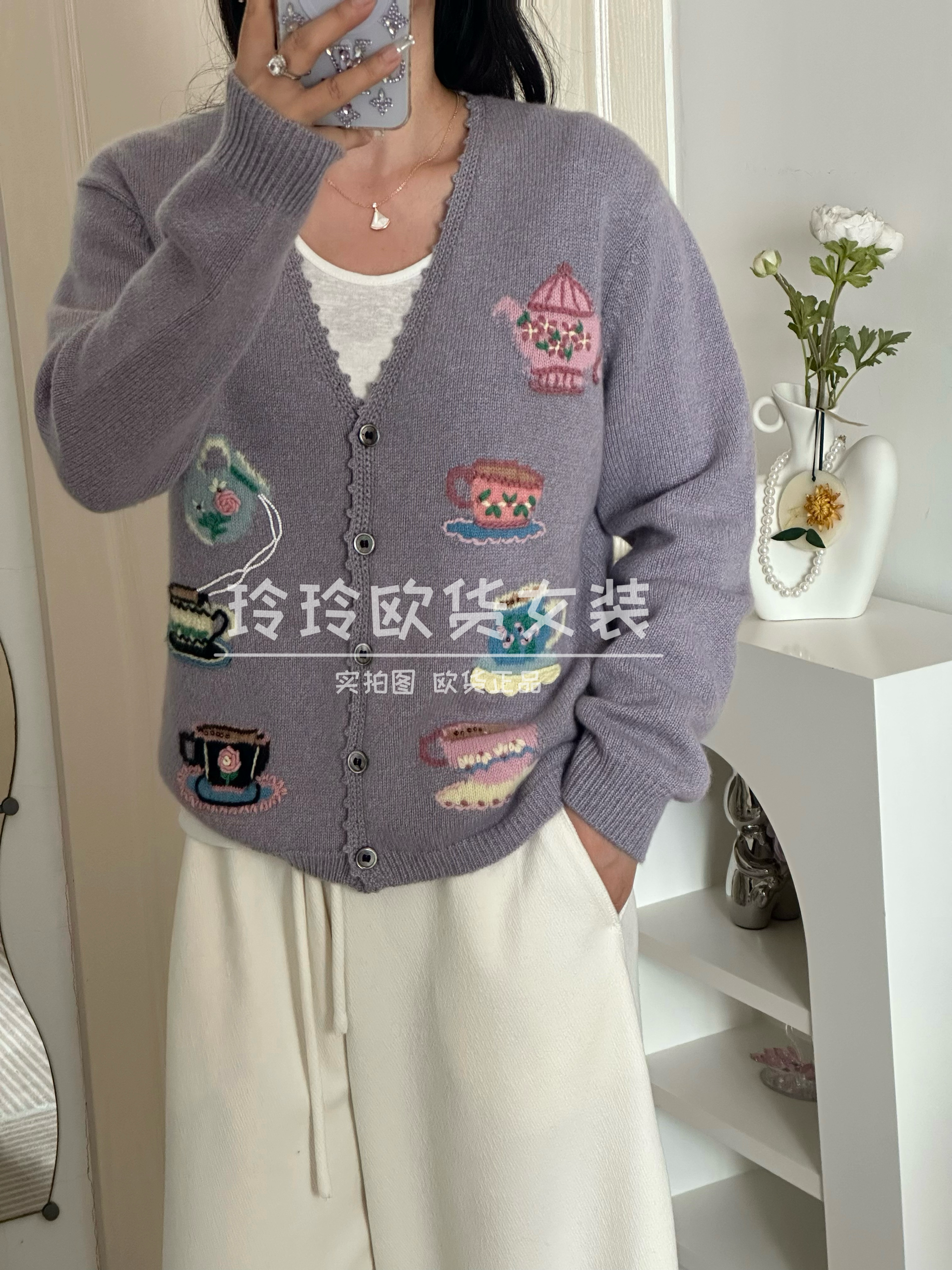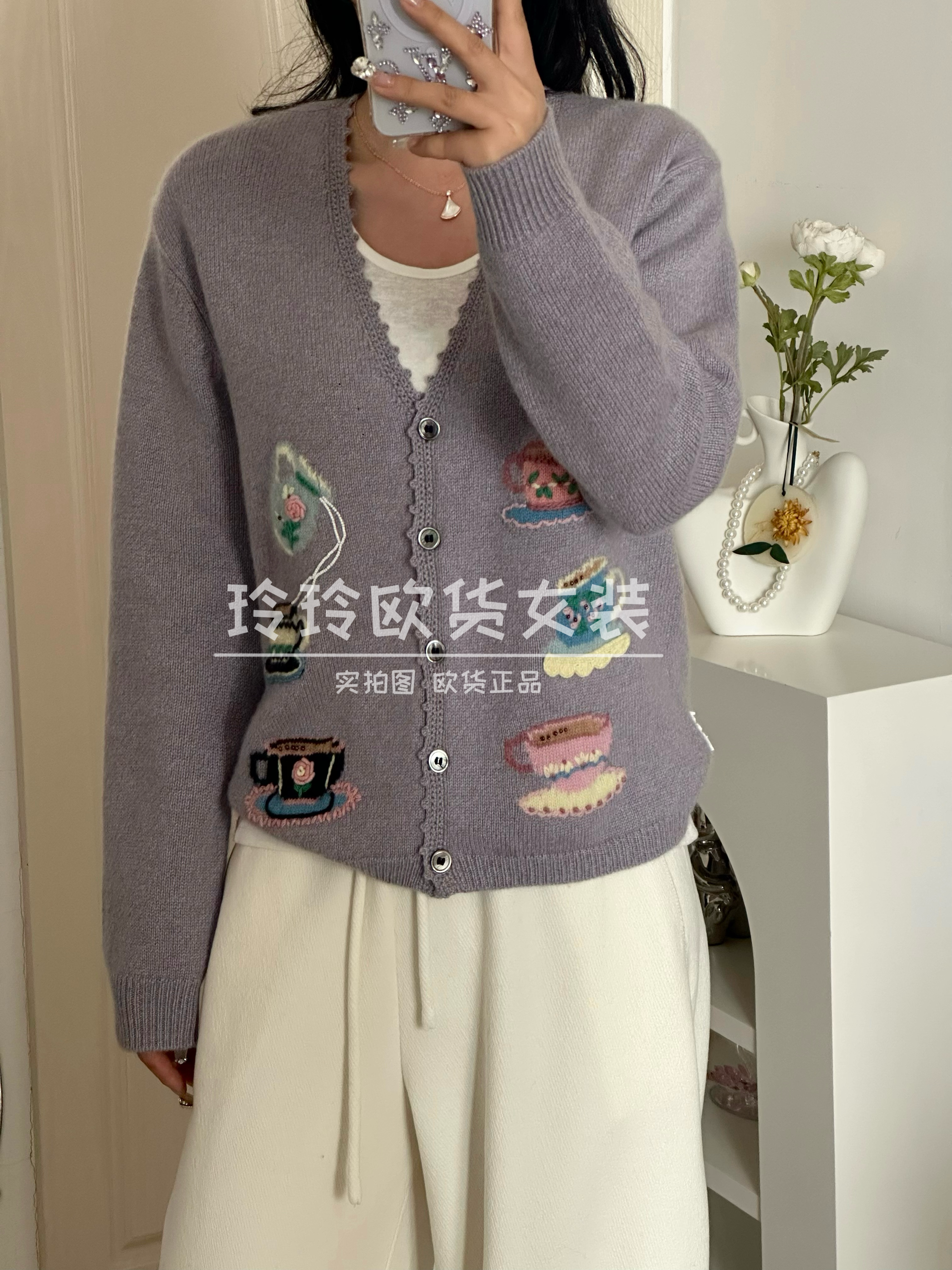 2025欧货高品质V领卡通图案纯手工绣花纯山羊绒开衫针织外套毛衣