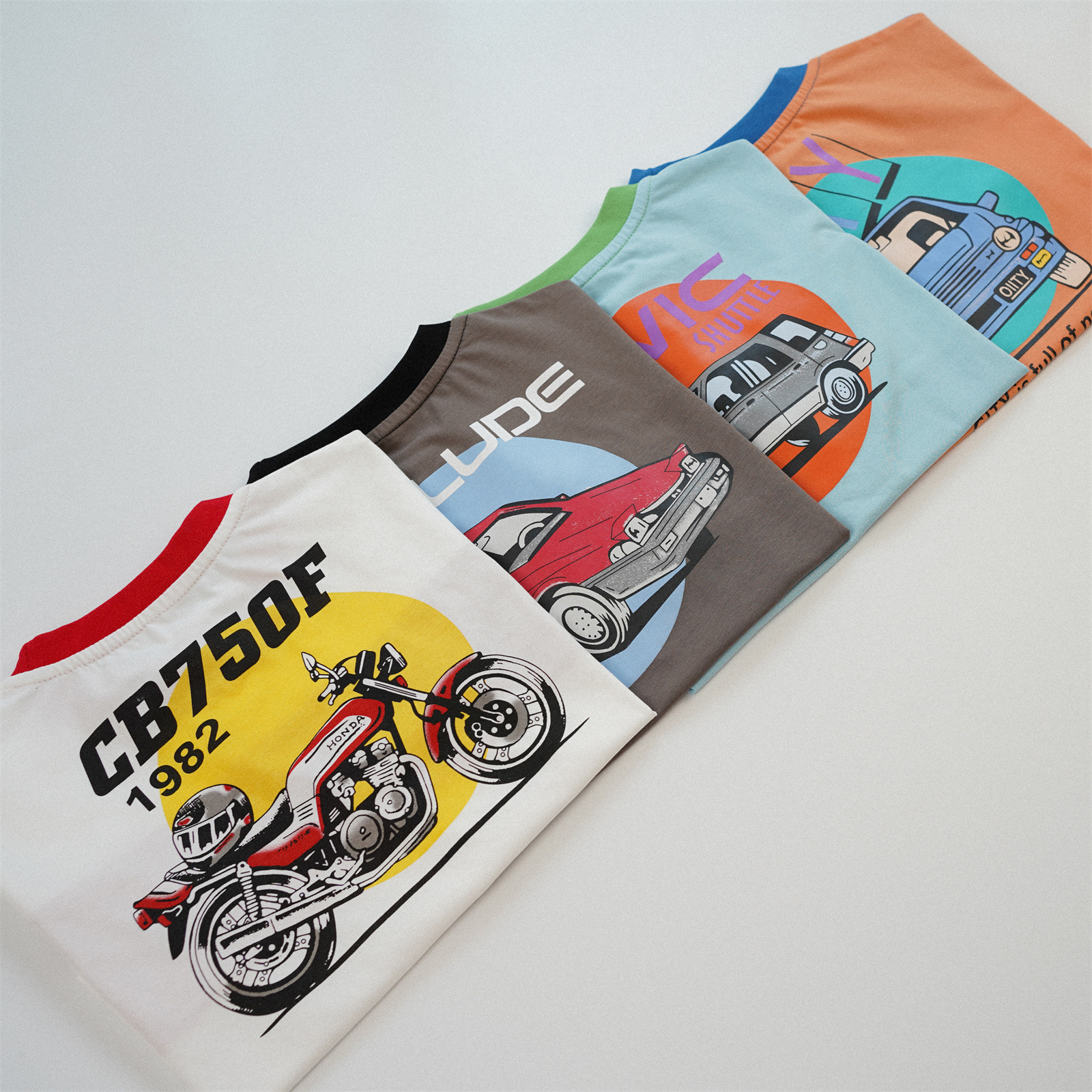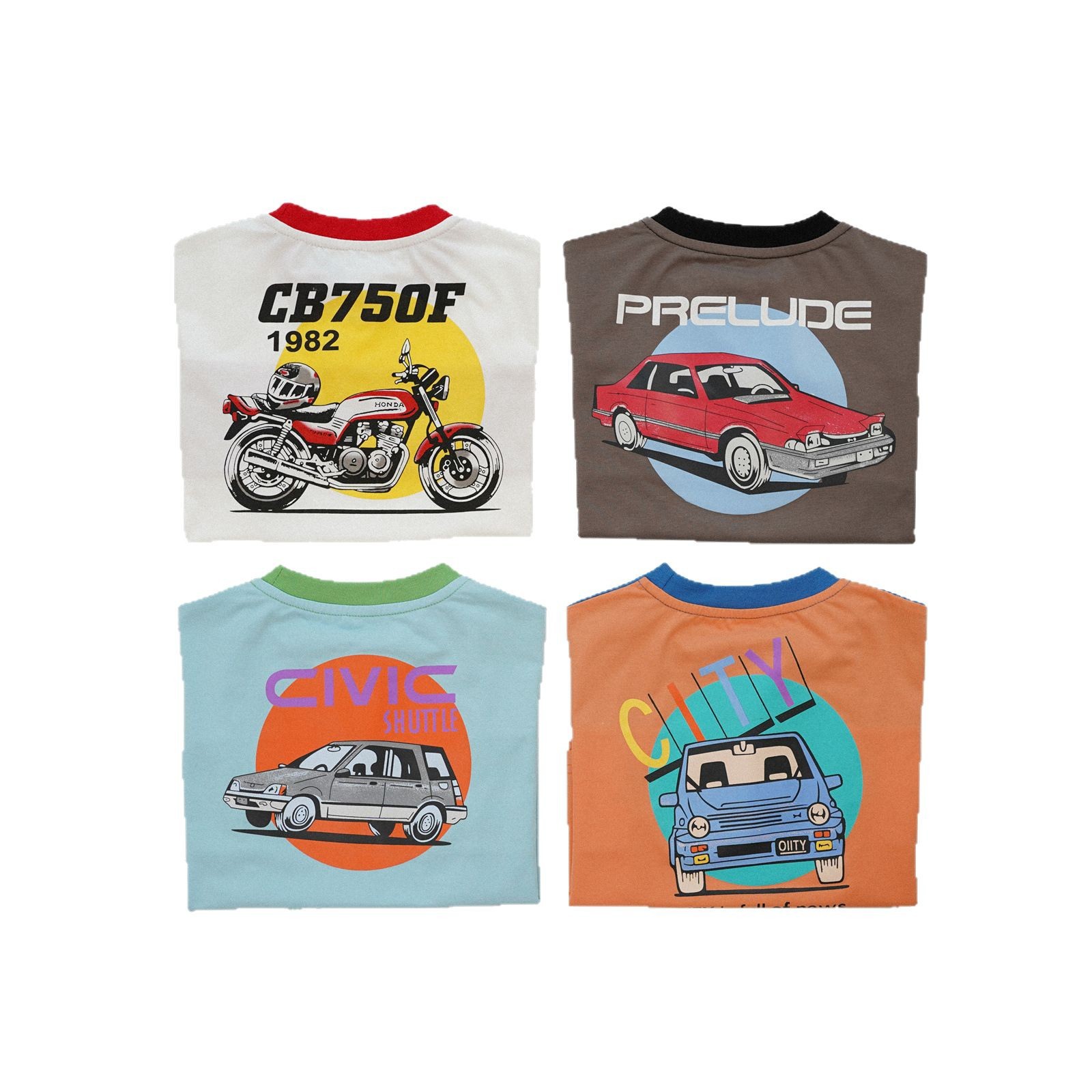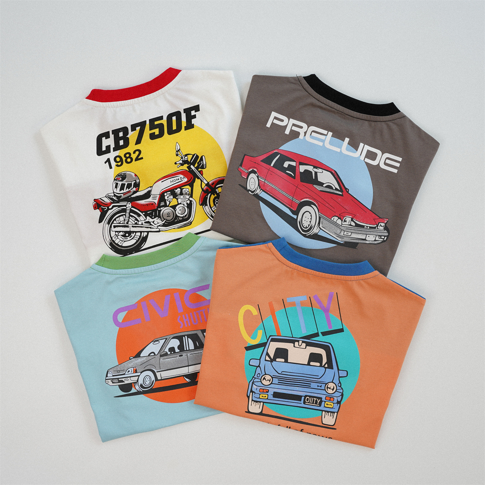 现货日系童装儿童拼色短袖t恤纯棉字母汽车上衣男女宝宝潮牌半袖