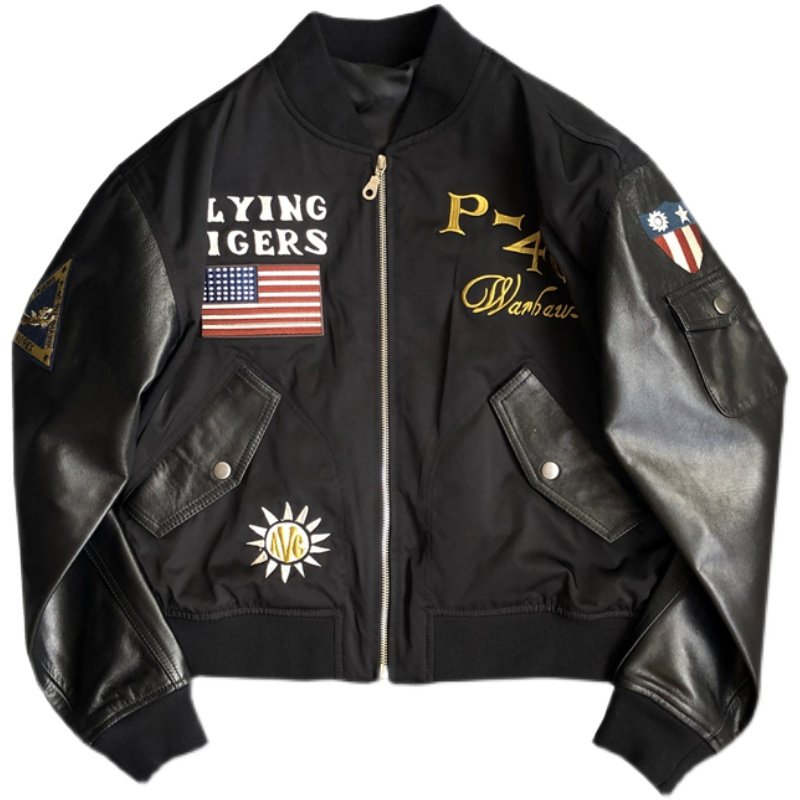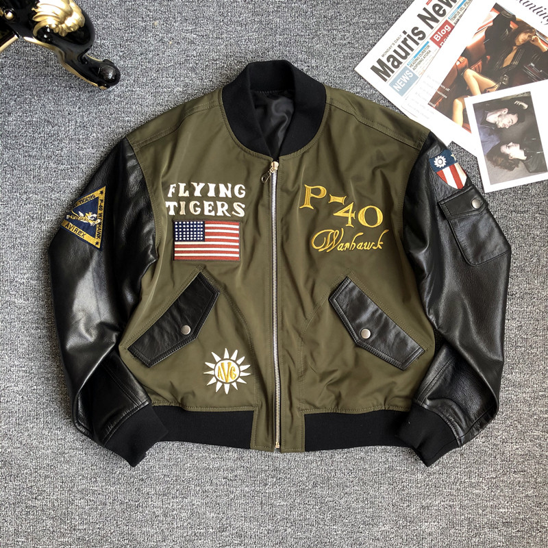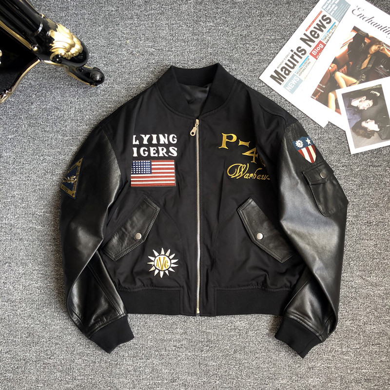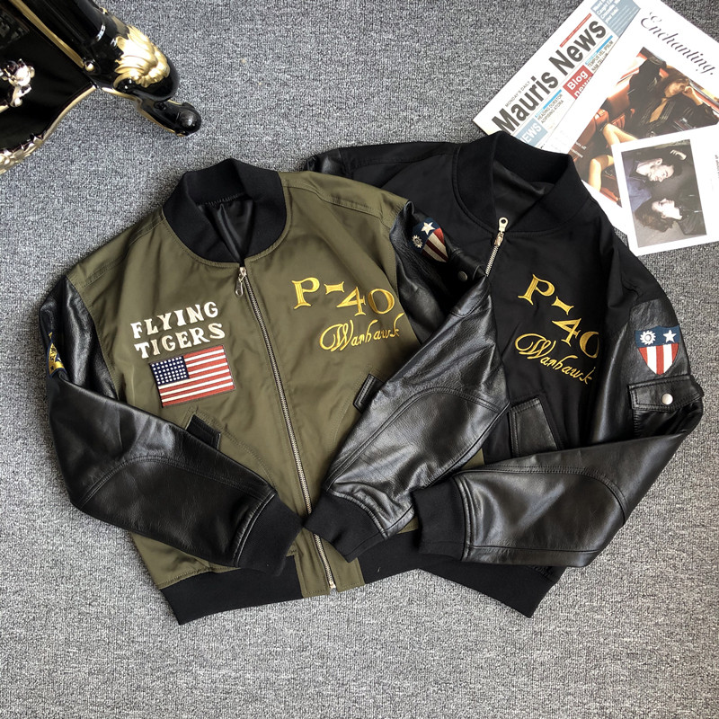 女皮衣真皮休闲夹克羊皮袖拼接棒球服落肩上衣刺绣外套宽松ins潮