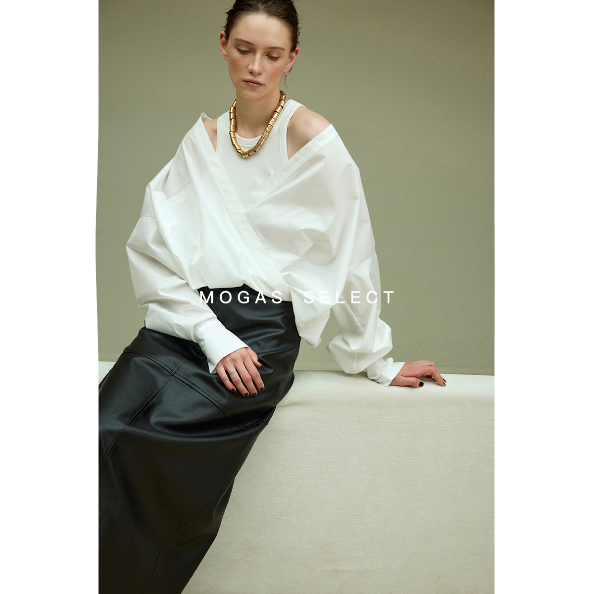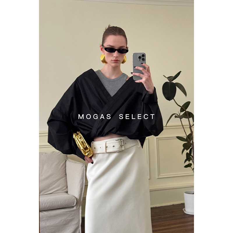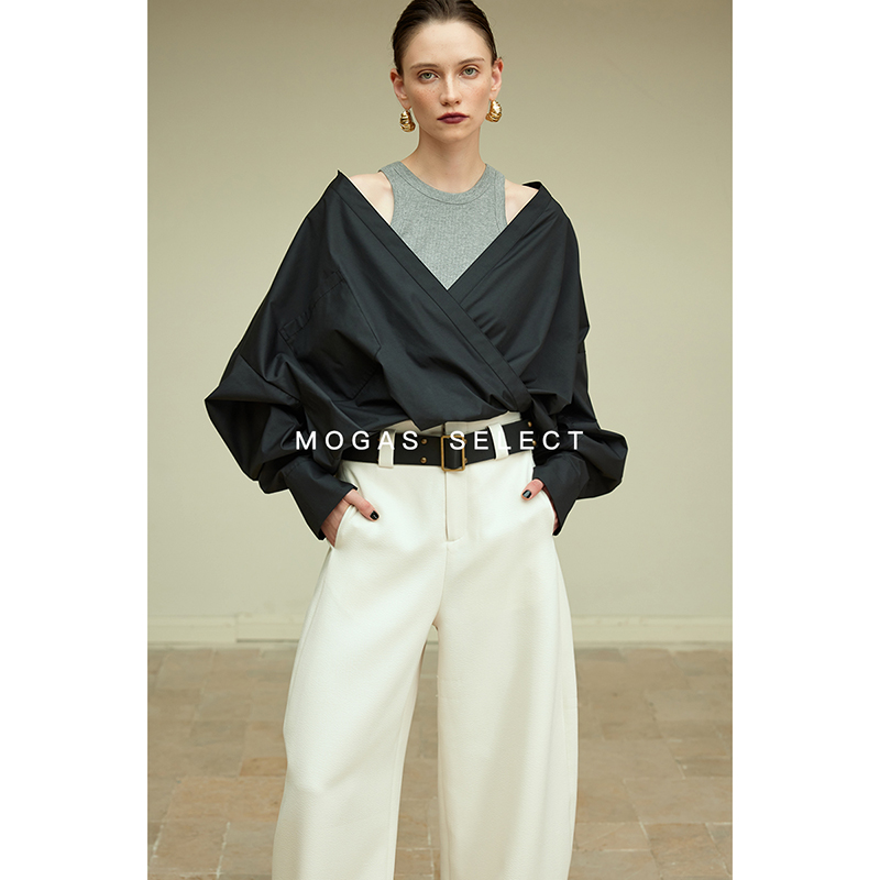 Mogas上身纸片人 品质环葆棉高支立体褶皱时髦假两件衬衫女上衣秋