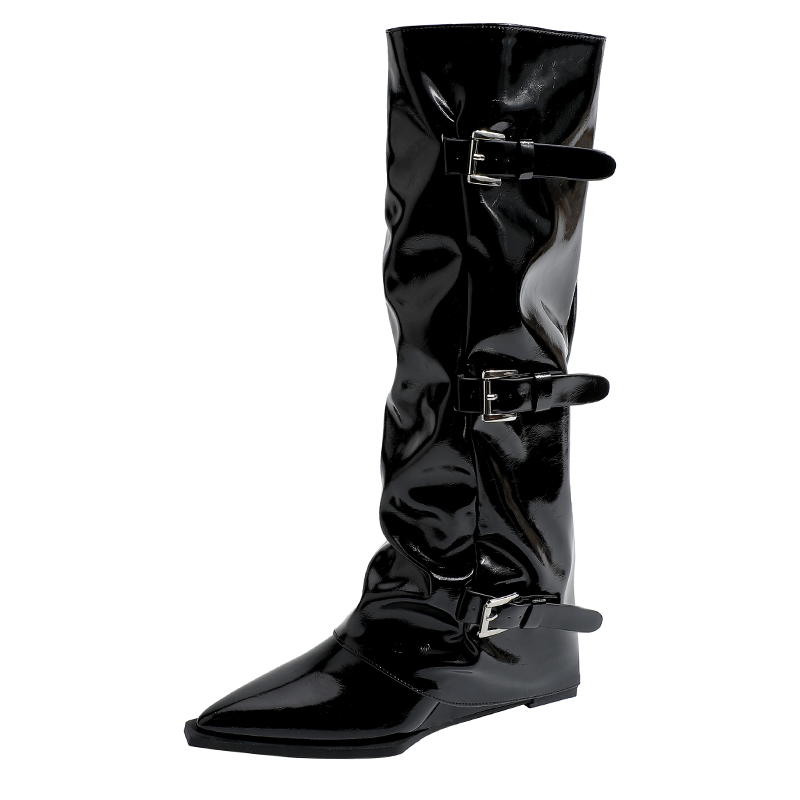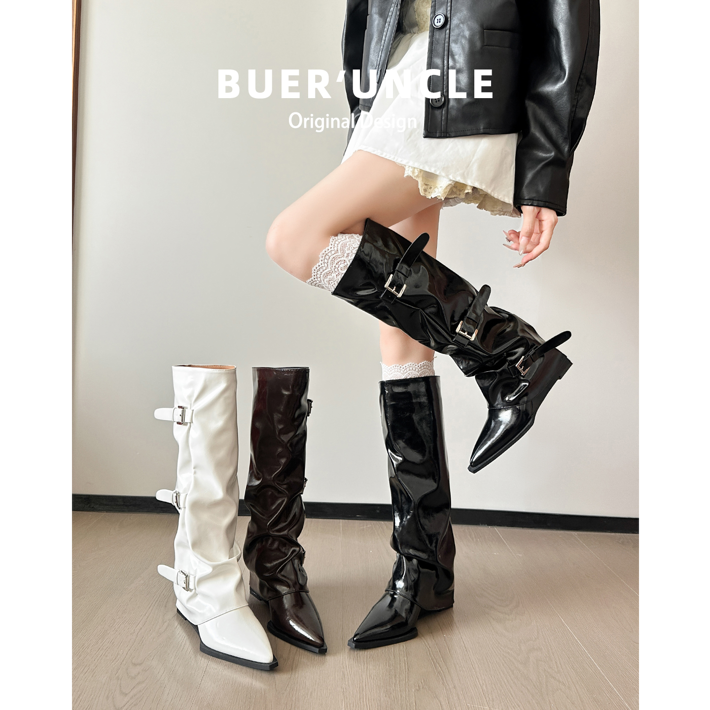 羊皮版!辣妹裤管长筒靴女内增高黑色废土风骑士靴皮带扣尖头长靴
