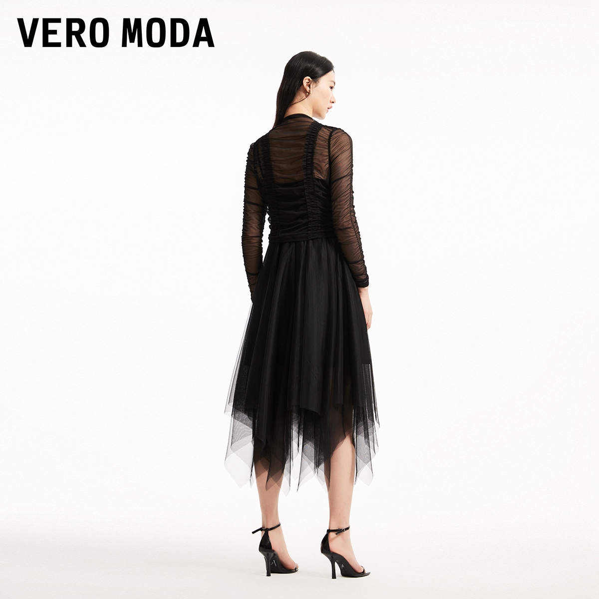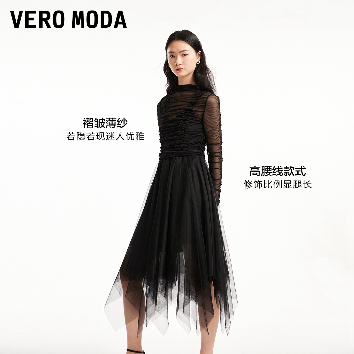 Vero Moda奥莱连衣裙春秋新款真两件薄纱褶皱不规则裙摆裙子流行