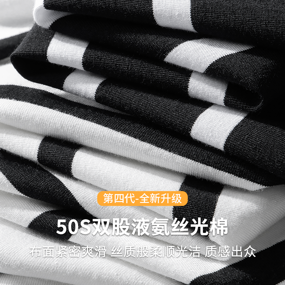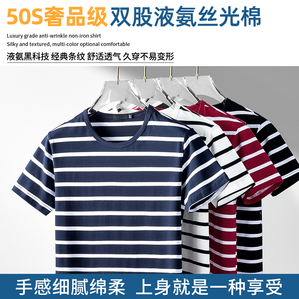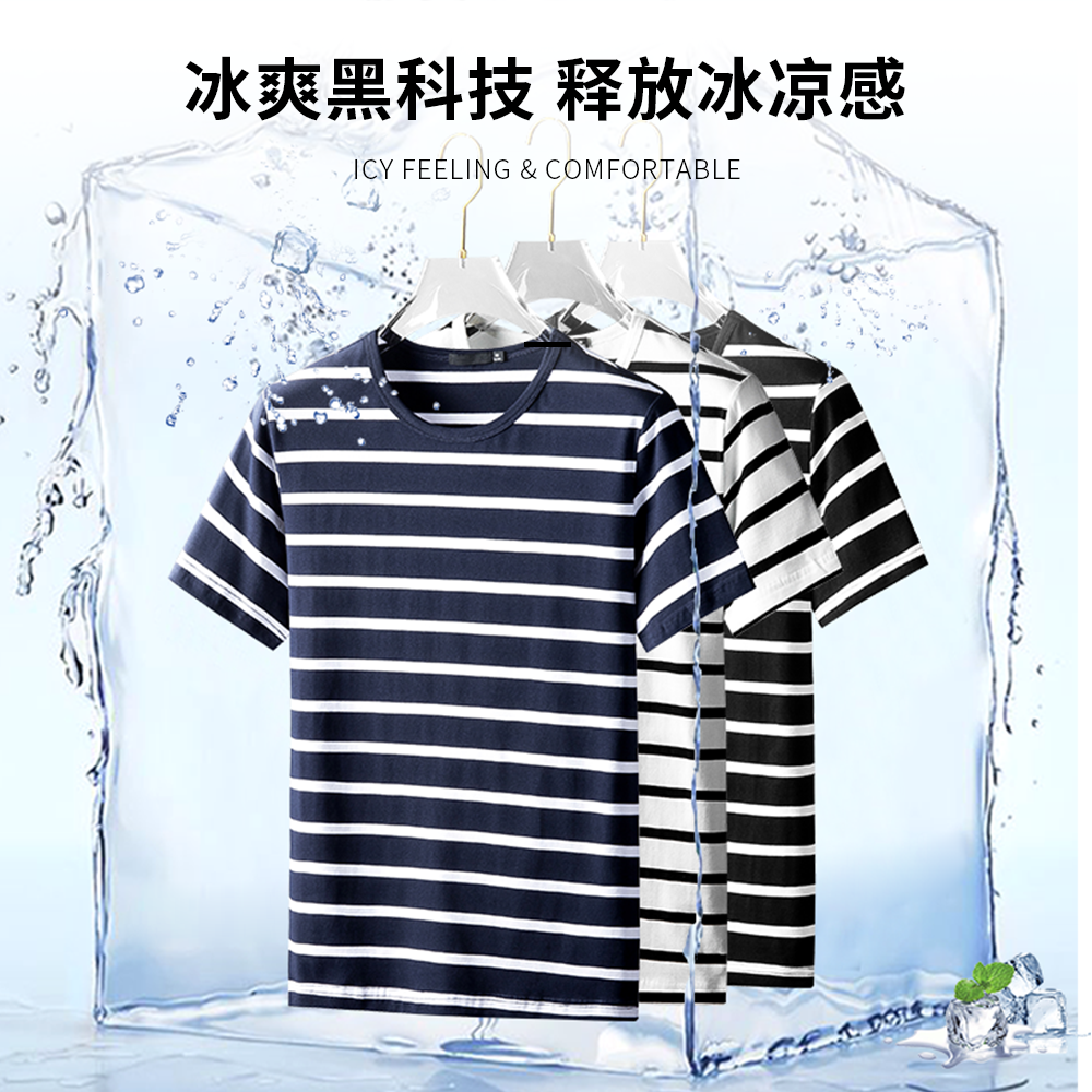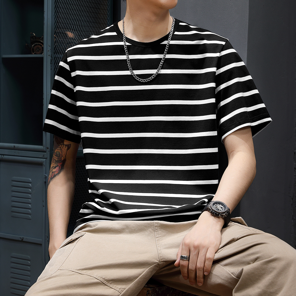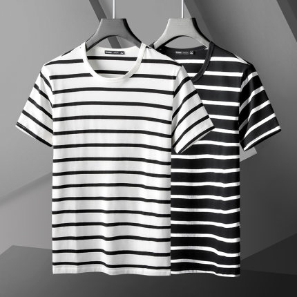 2025新款黑白条纹短袖t恤男夏季丝光棉圆领体恤修身潮流半袖大码