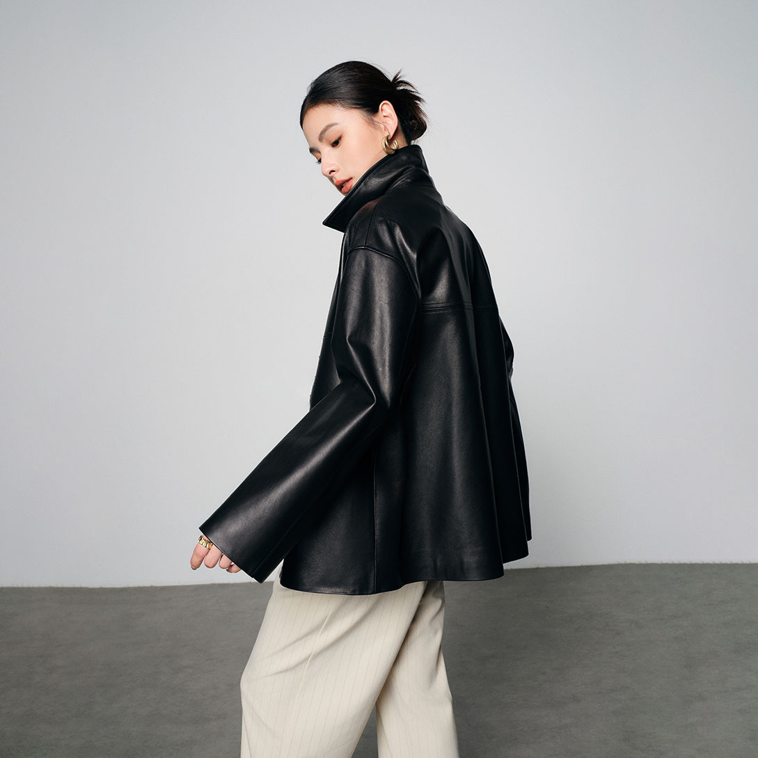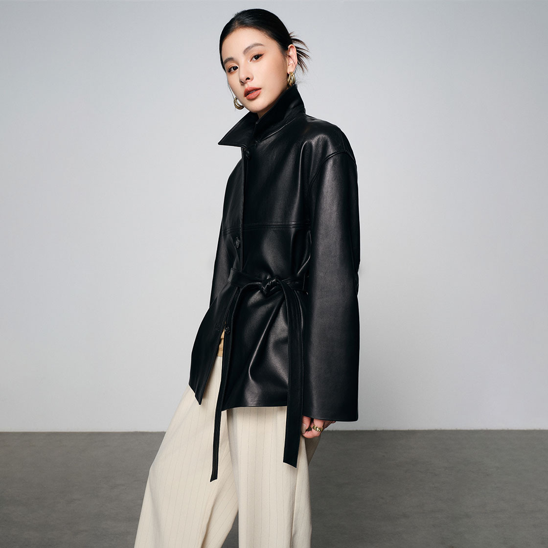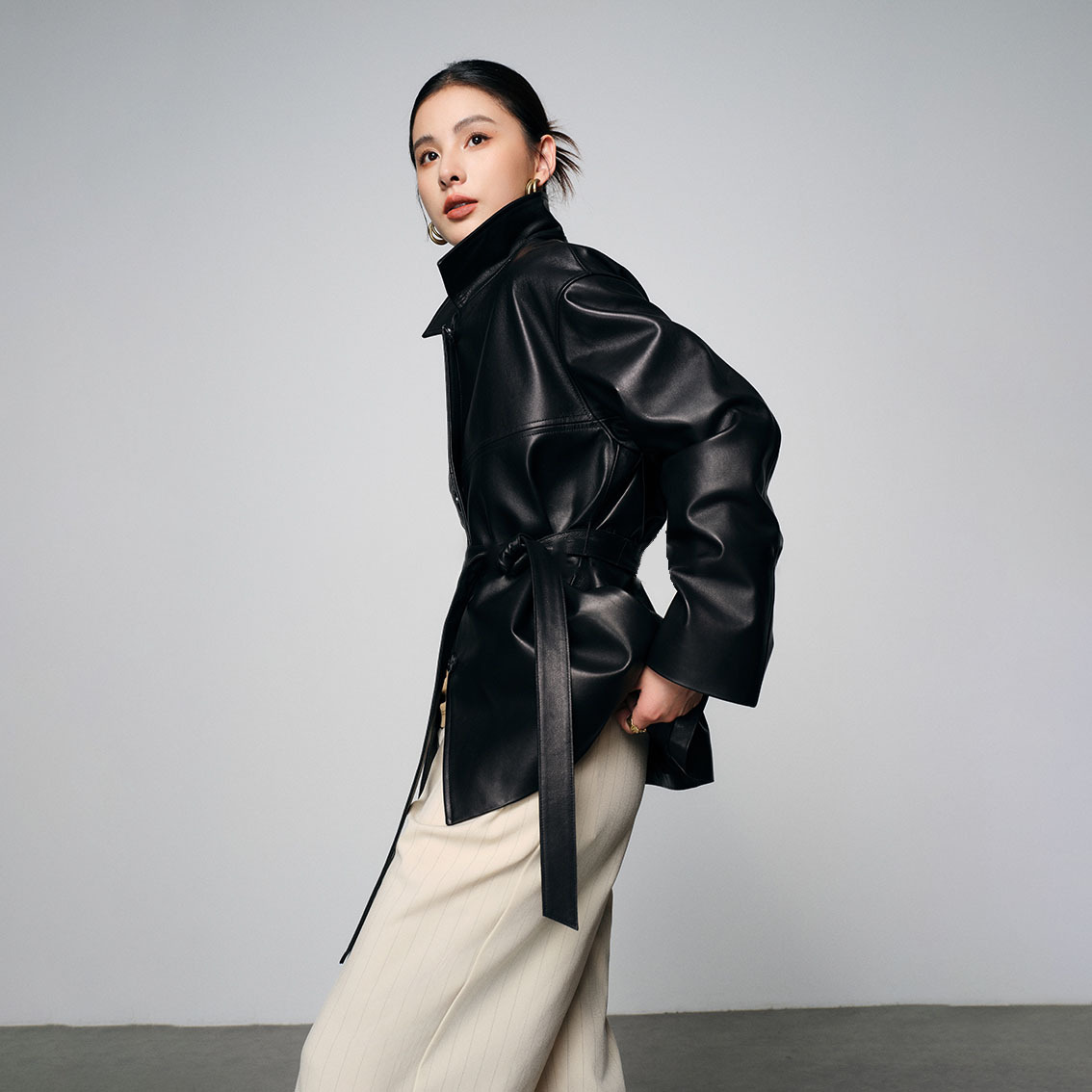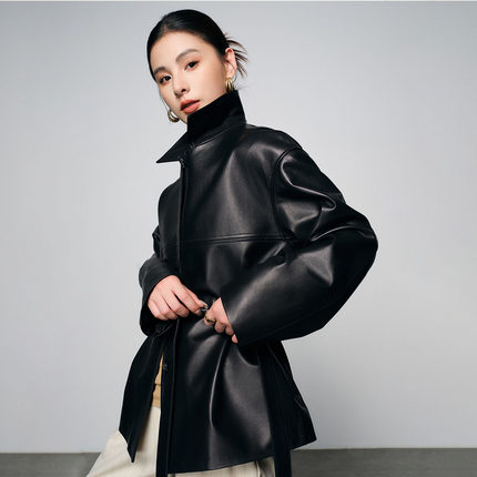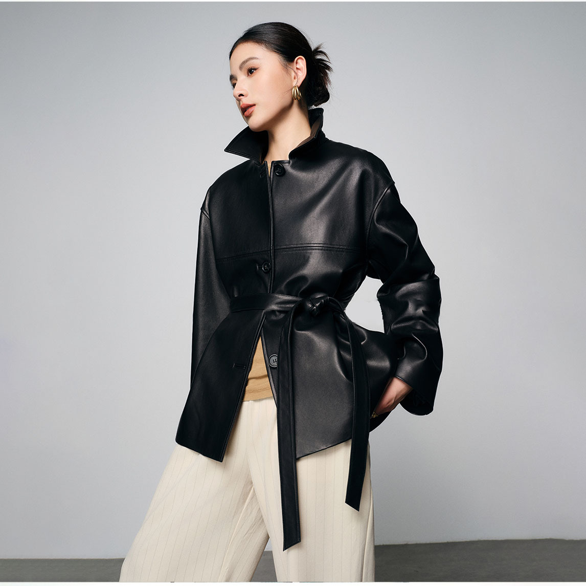今年流行特惠春秋季新款轻奢绵羊皮真皮皮衣女翻领单排扣系带