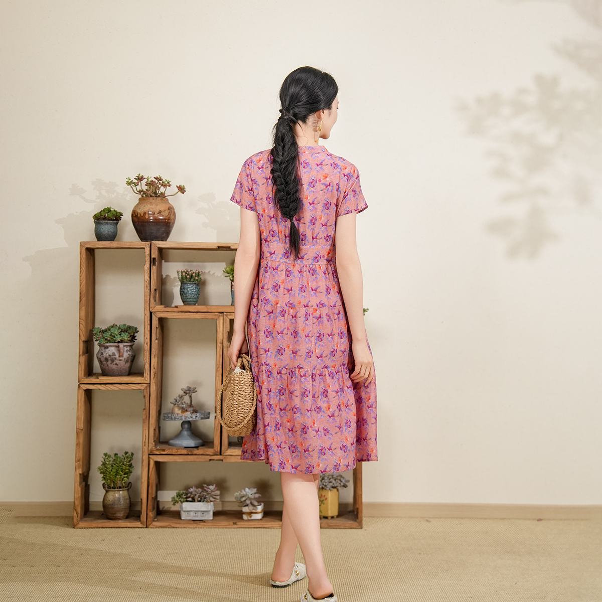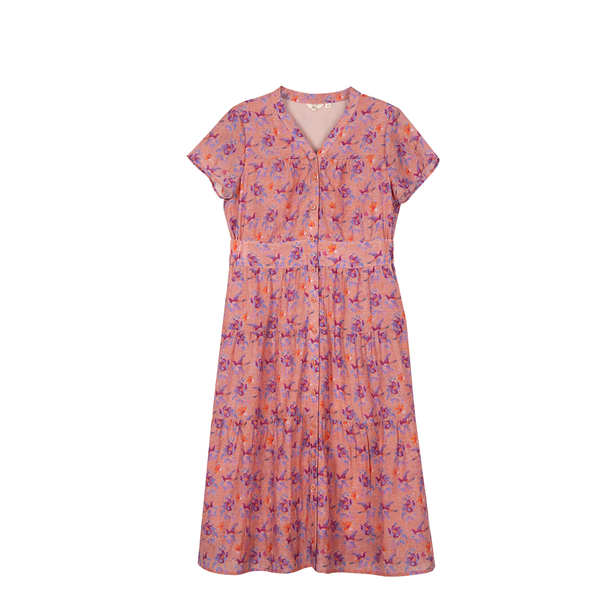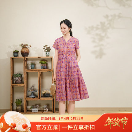 布符2025年夏季新品V领收腰抽褶连衣裙女装短袖显瘦飘逸花卉印花