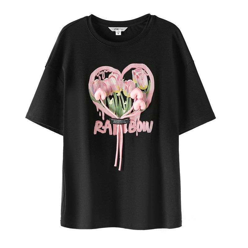 粉色印花短袖T恤女2025夏季新款宽松显瘦设计感立体花朵休闲上衣
