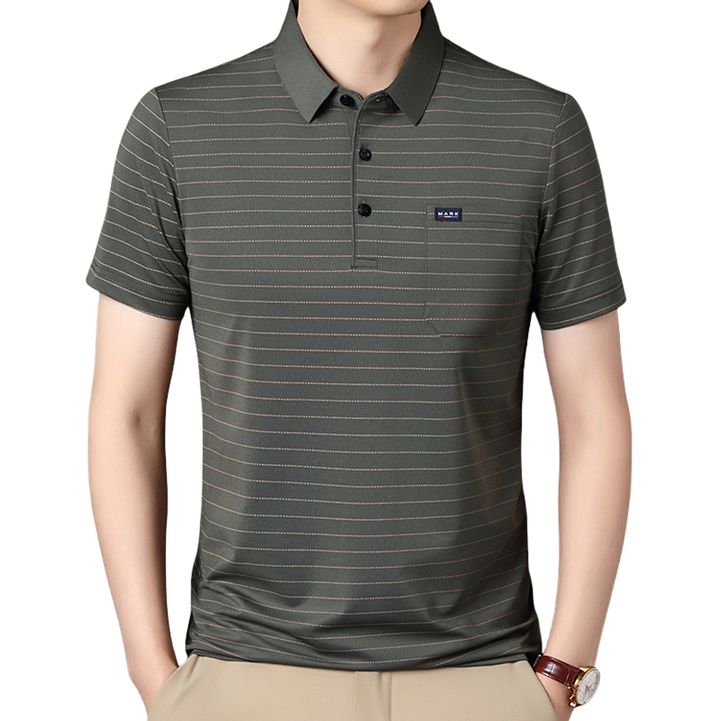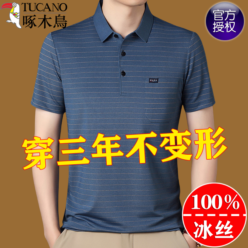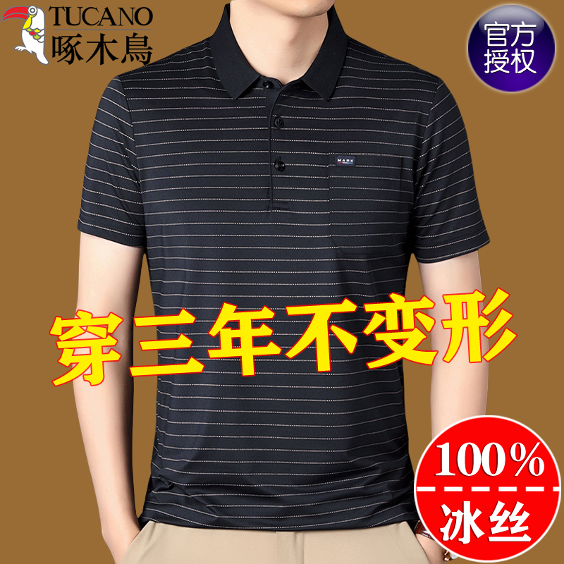 啄木鸟纯棉男士短袖t恤翻领冰丝polo衫半袖薄款宽松大码条纹体恤
