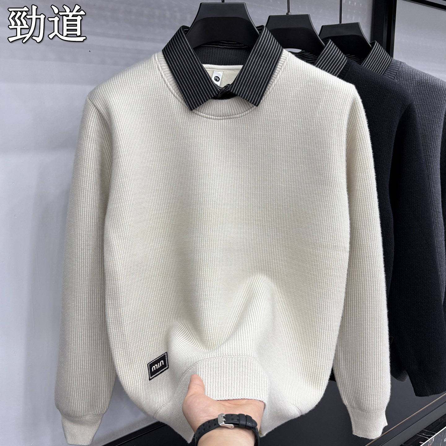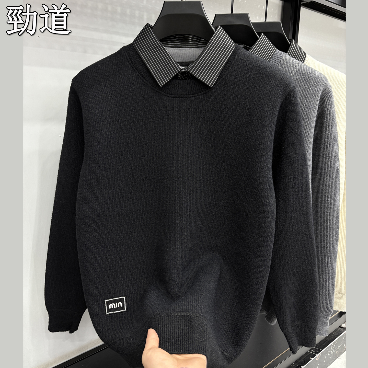 男士假两件衬衫领毛衣秋冬季加绒加厚保暖休闲打底衫带领针织衫男