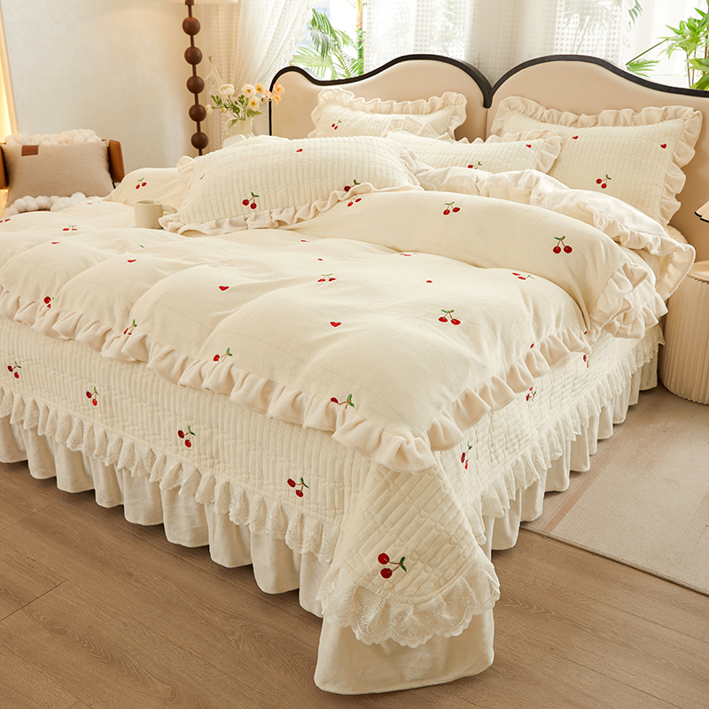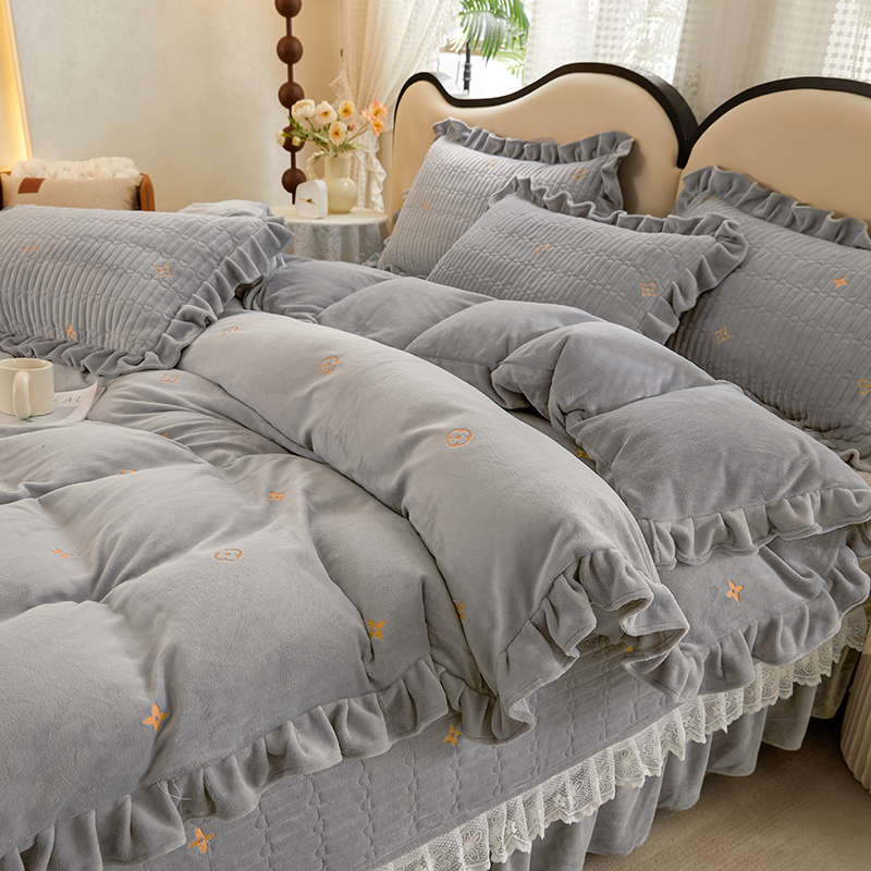 牛奶絨床盖四件套秋冬季保暖加厚简约双面绒花边被套高级感双面绒
