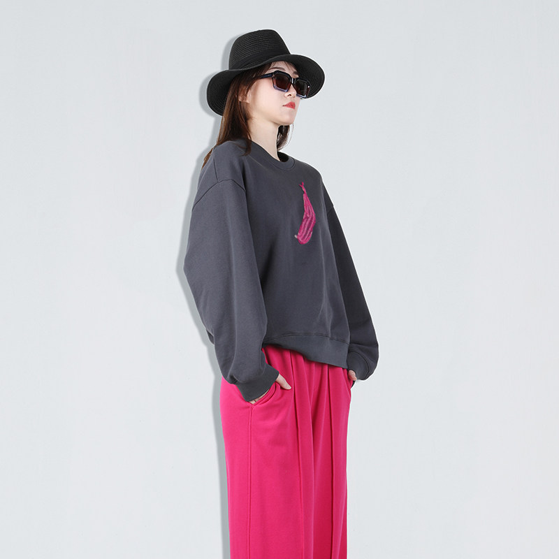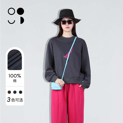 未知未觉新品短款休闲套头宽松2024年早秋黑色纯棉长袖圆领卫衣女