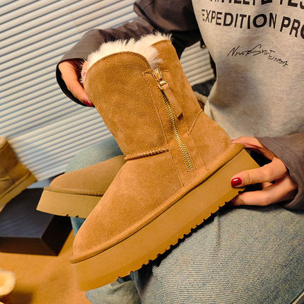 雪地靴女款2025新款冬季加绒加厚皮毛一体厚底面包鞋中筒拉链棉鞋