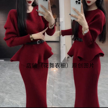 气质名媛轻奢优雅风红色针织套装女秋冬收腰包臀裙气质时尚两件套