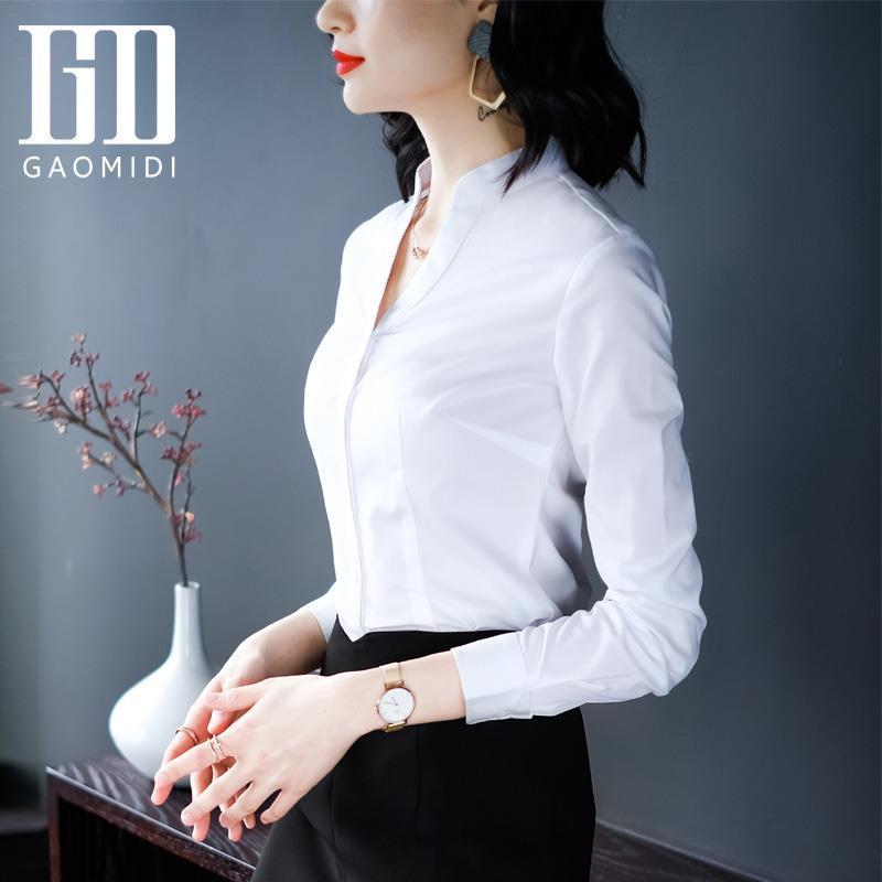 职业白色衬衫女长袖V领立领商务正装工作服衬衣套装4S店工装上衣