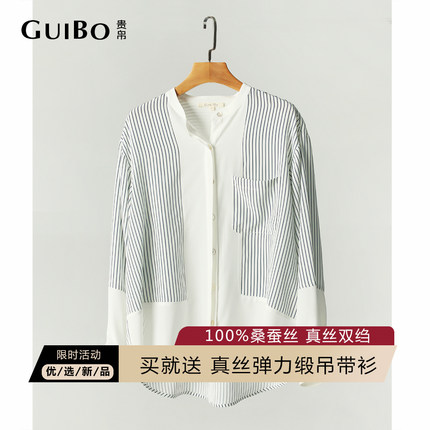 宽松长袖100%桑蚕丝条纹衬衫真丝