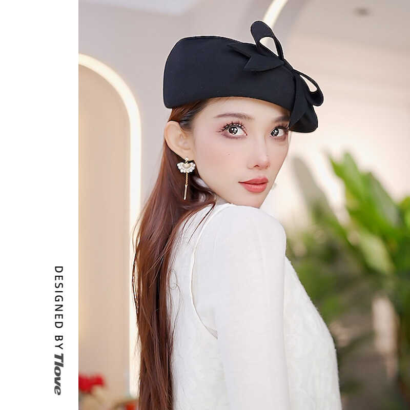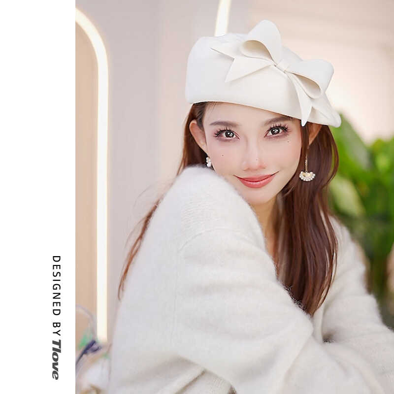 9637甜美可爱羊毛毡礼帽女士秋冬季新款韩版潮百搭蝴蝶结毛呢帽子