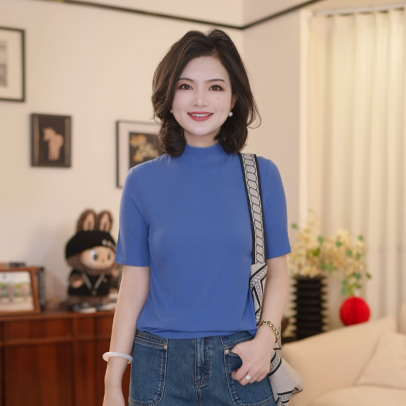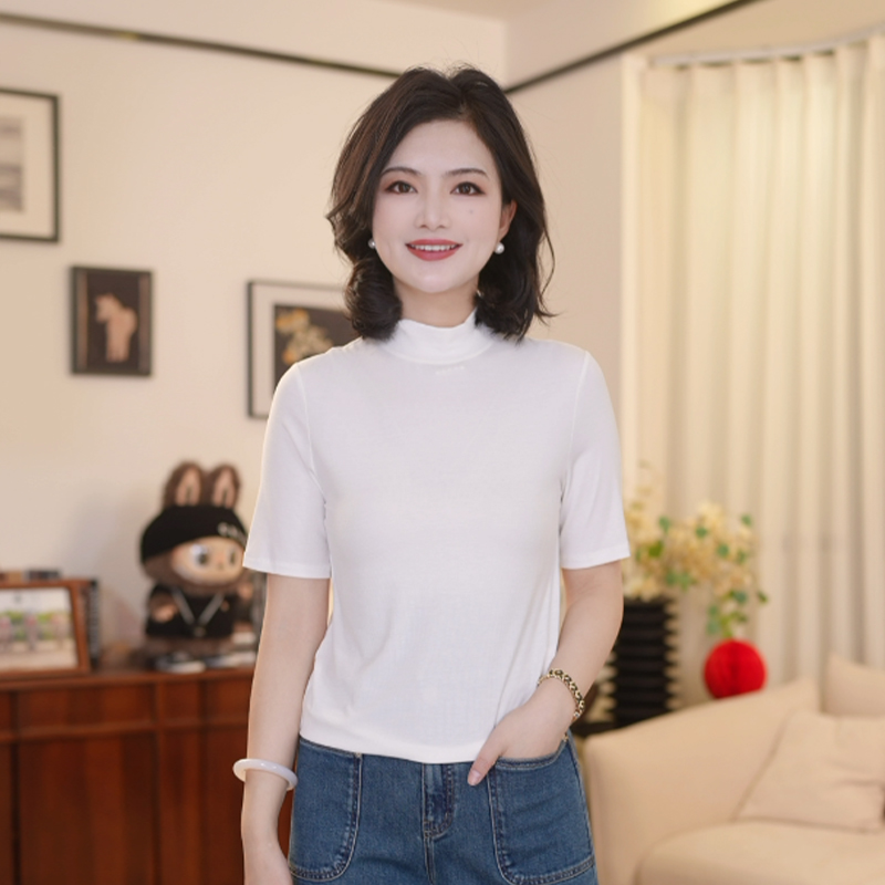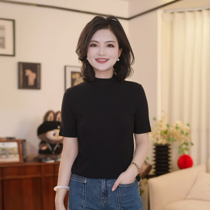 枫竺百搭气质短袖半高领针织衫女2025年秋季新款打底中袖T恤上衣