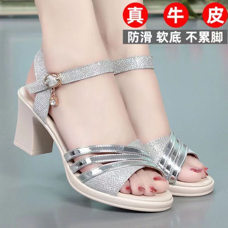 全牛皮真皮凉鞋女舒适女鞋子高跟粗跟夏季中跟软底防滑妈妈鞋时尚