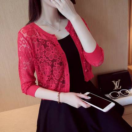 夏季新款韩版蕾丝七分袖短款针织开衫女外套披肩镂空薄款防晒罩衫
