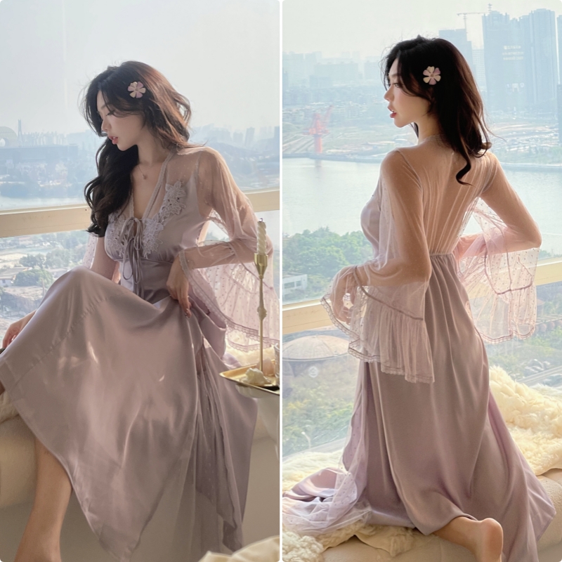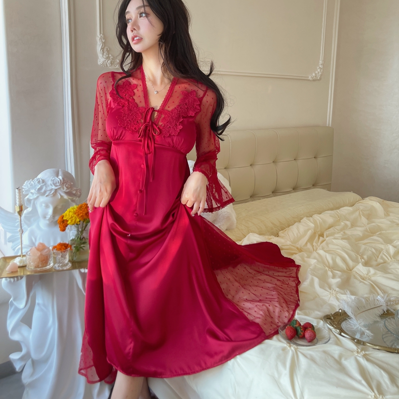 带胸垫夏季睡衣女春秋性感冰丝绸缎面蕾丝睡裙长款甜美公主家居服