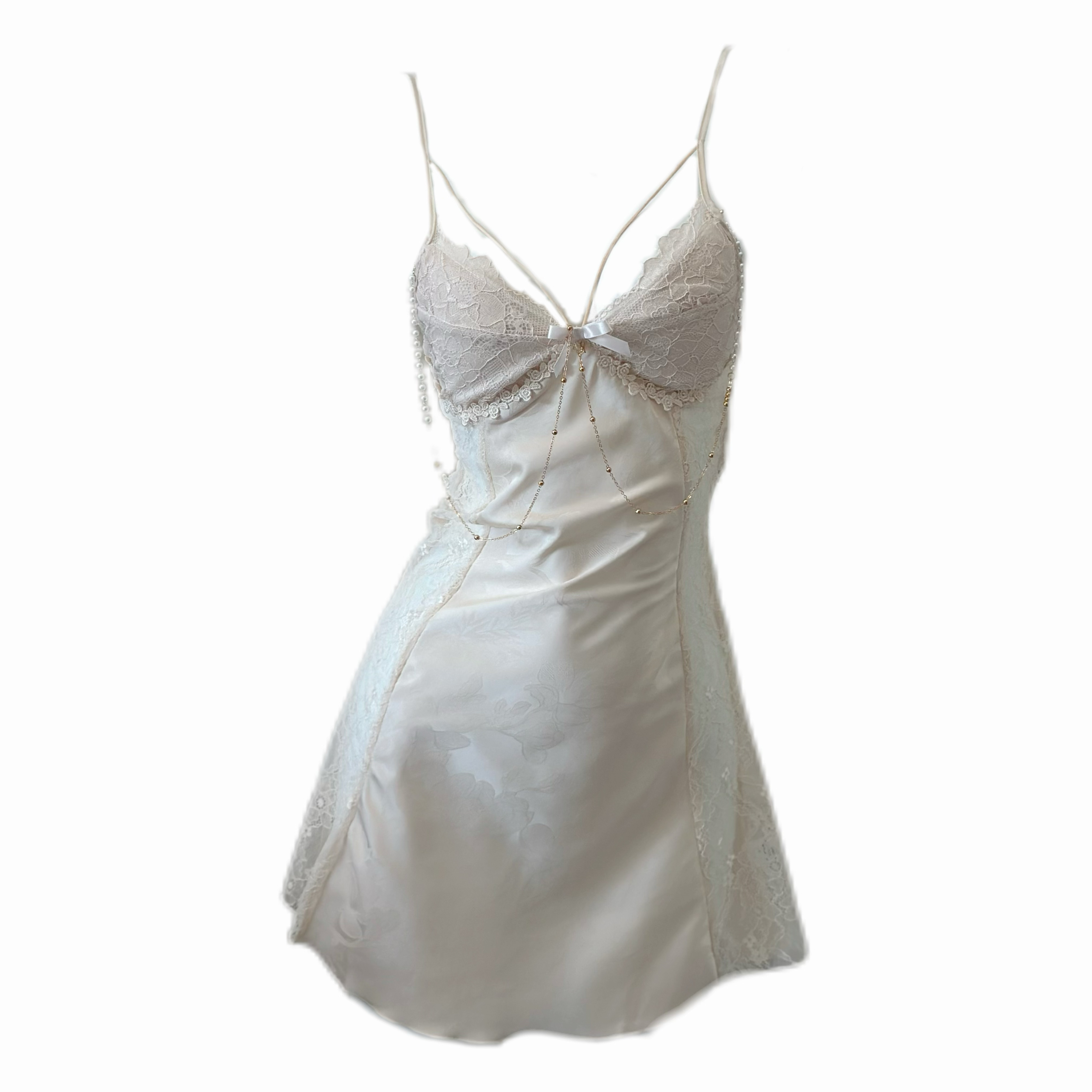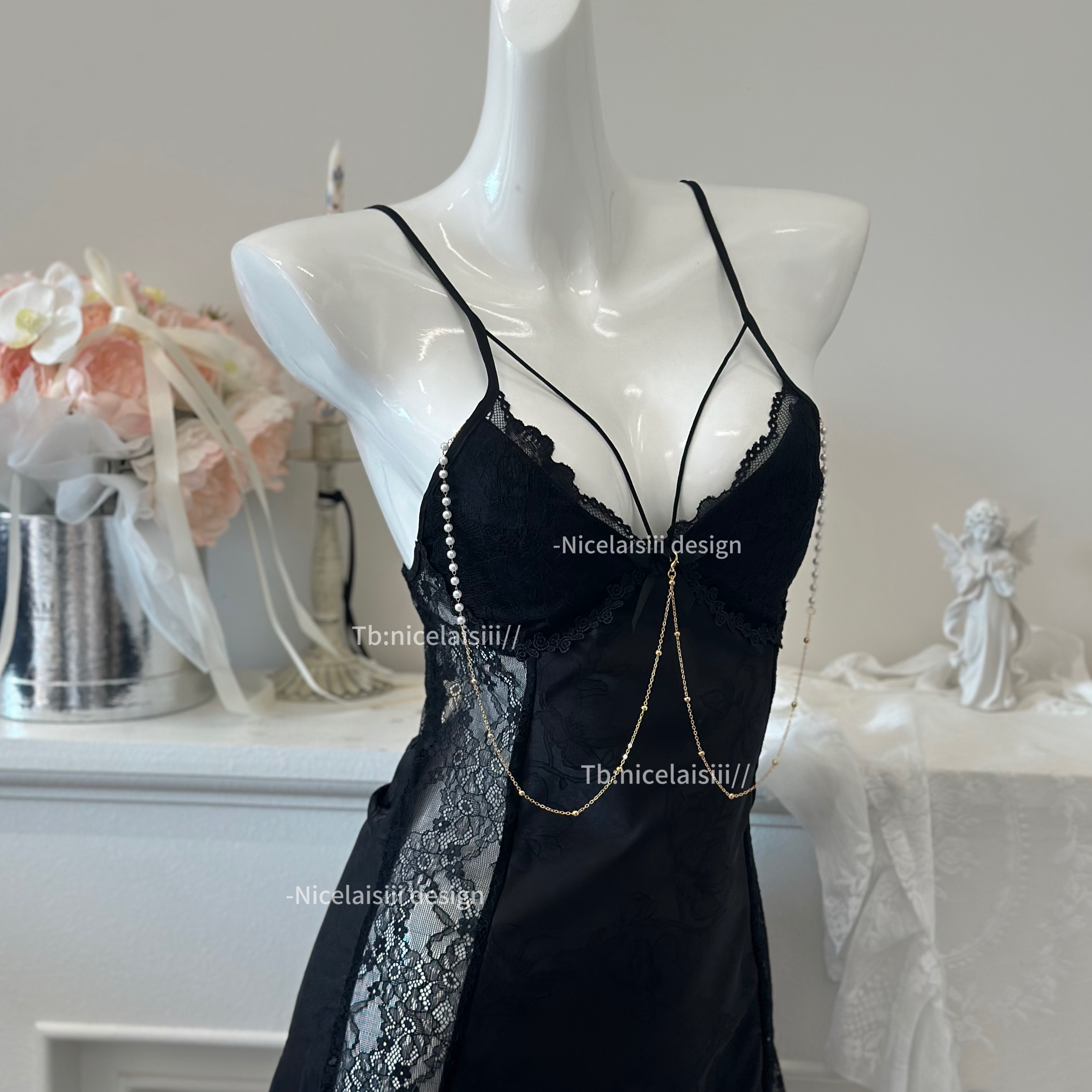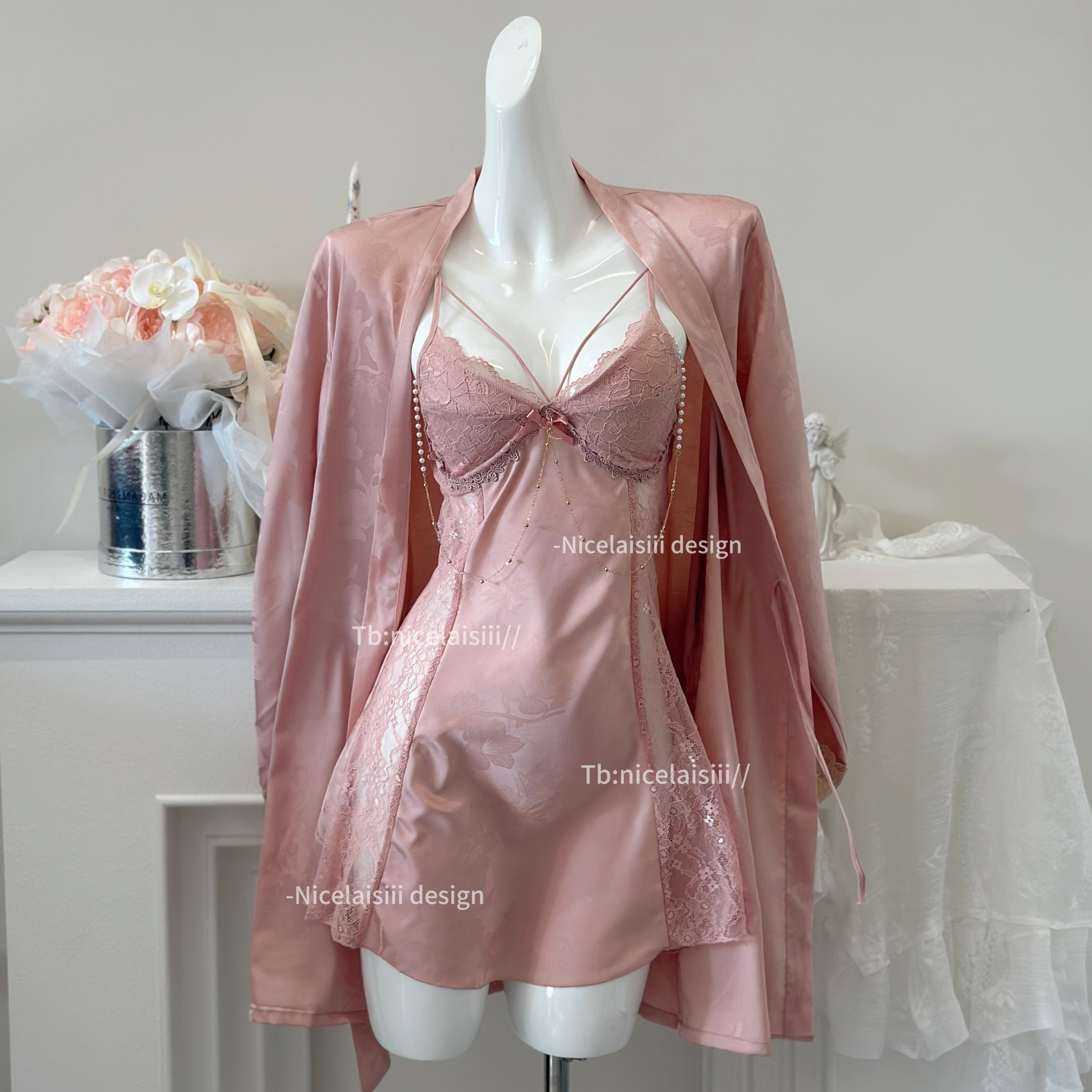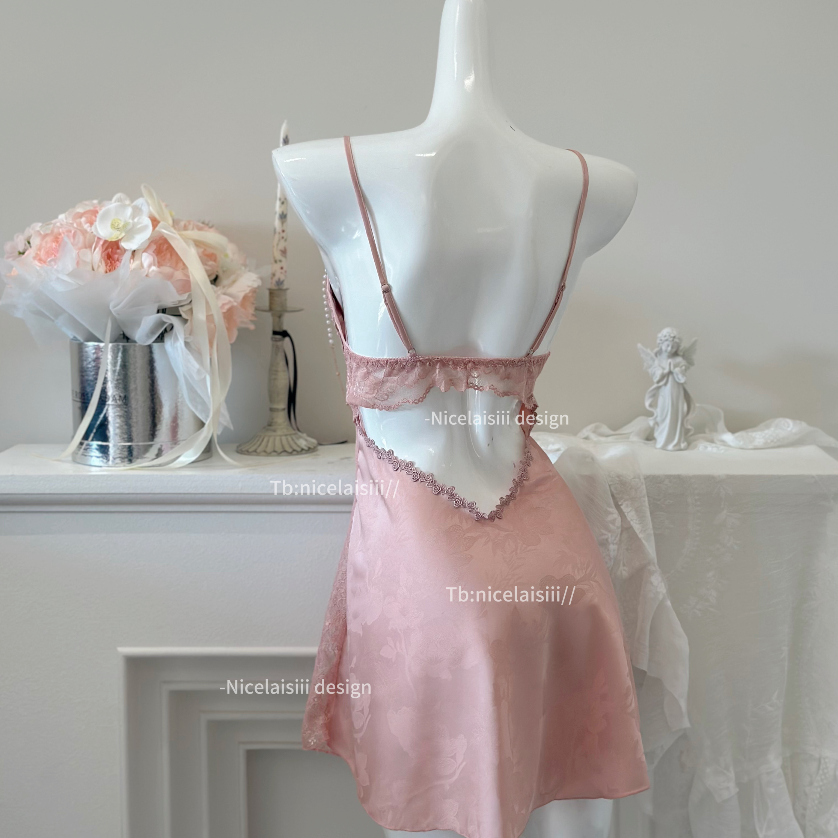 Nicelaisiii花想容 暗纹提花性感吊带睡裙带胸垫法式蕾丝深v睡衣