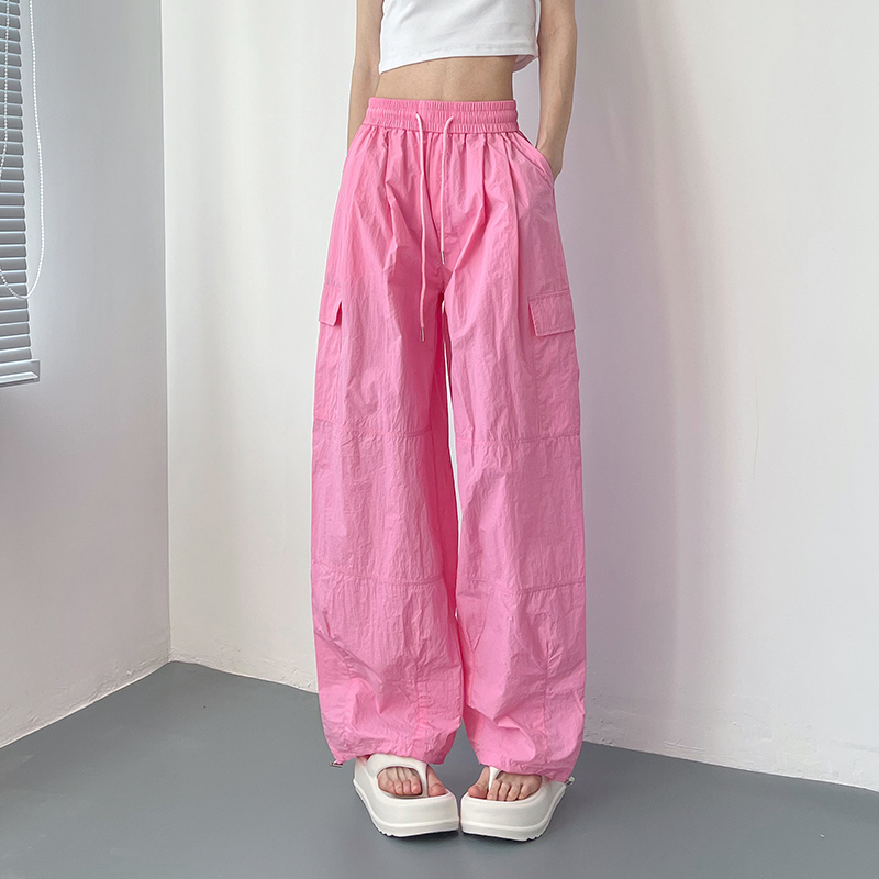 胖mm大码粉色工装裤女夏季薄款遮肉显瘦百搭高腰速干伞兵阔腿裤