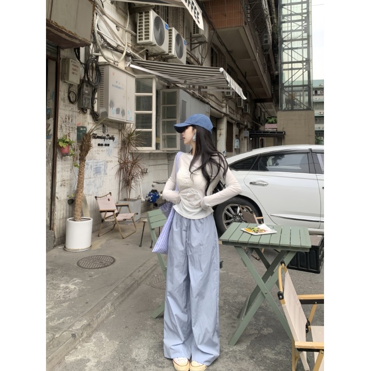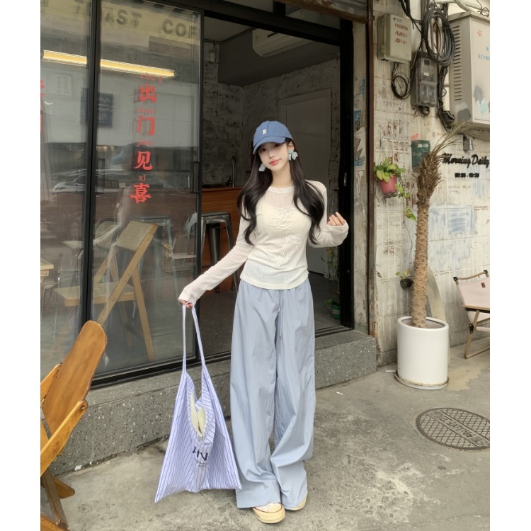 胖mm韩剧穿搭一整套巨显瘦立体印花微透长袖T恤+休闲阔腿裤两件套