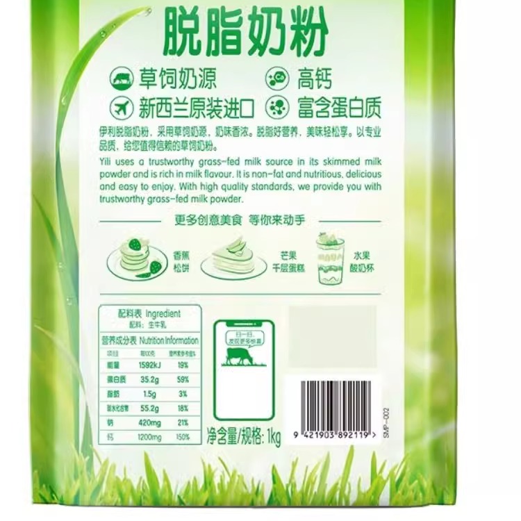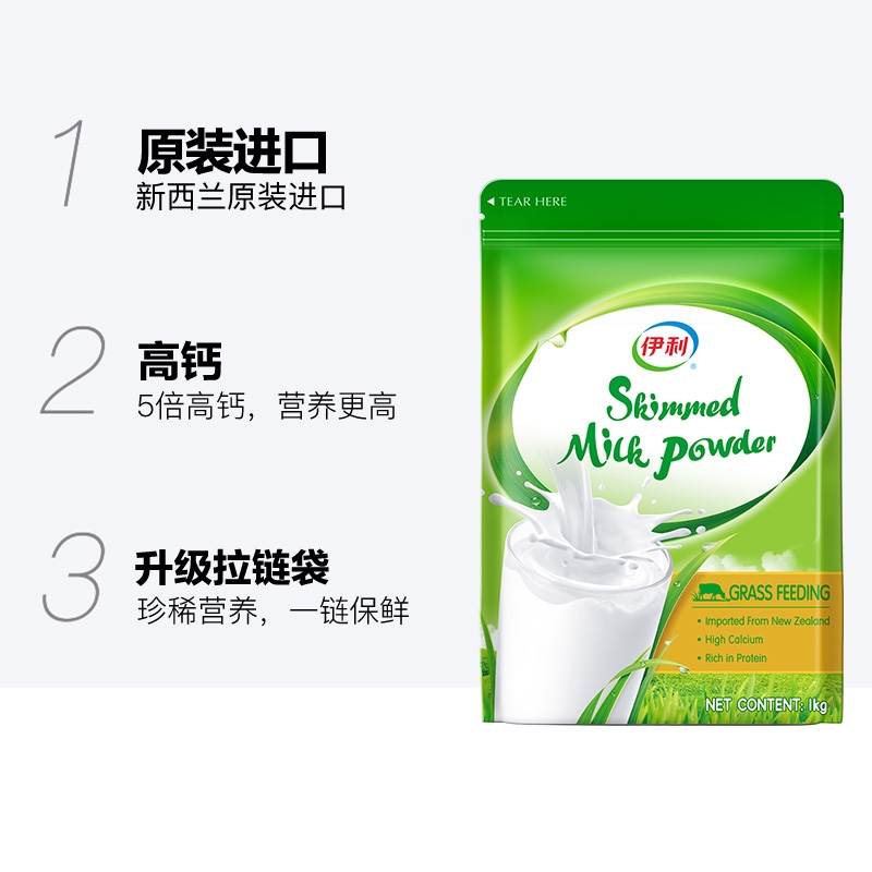 伊利新西兰进口脱脂奶粉高钙成人男女士学生中老年无蔗糖生牛乳粉