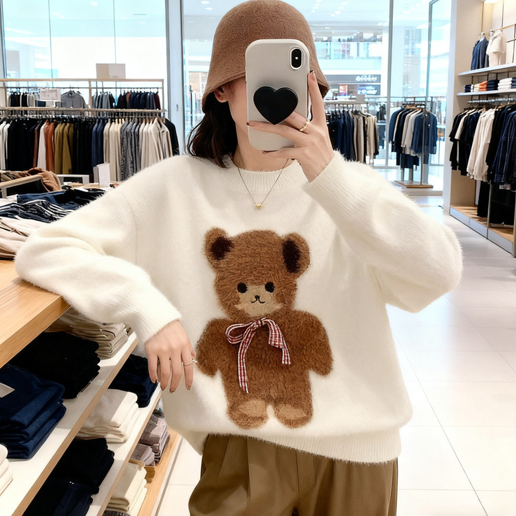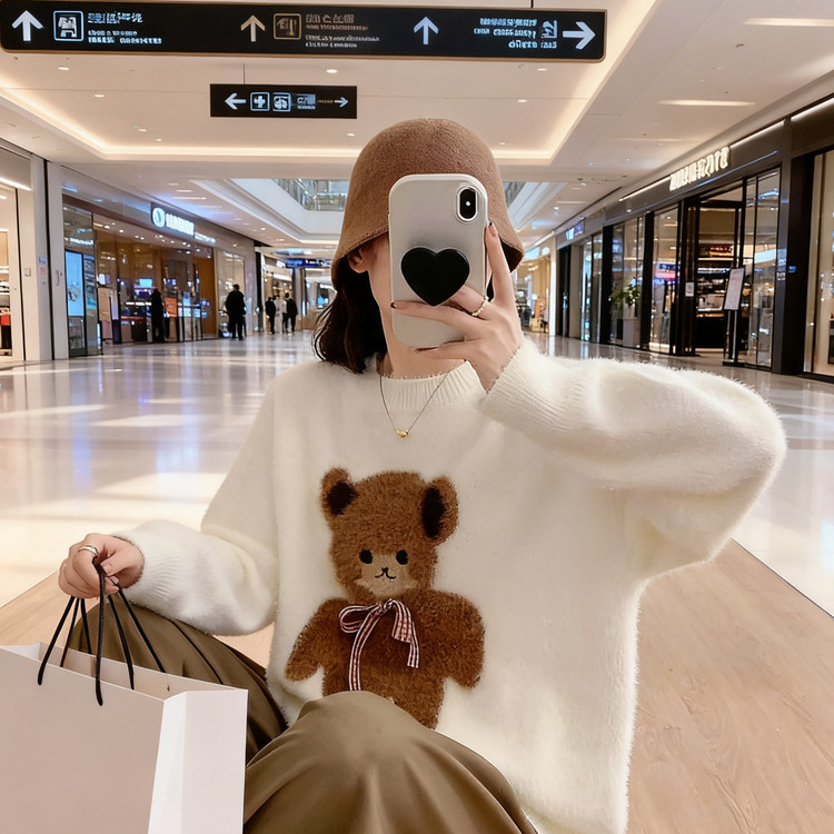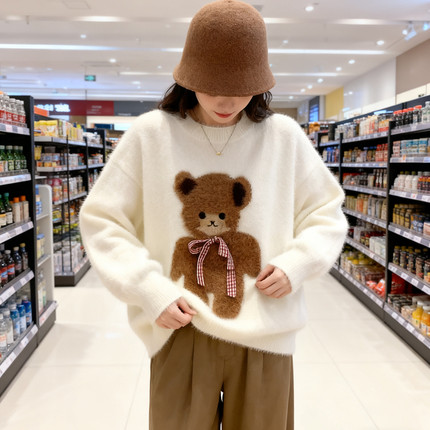 2025新款白色宽松圆领套头毛衣女秋冬小个子软糯水貂绒针织衫上衣