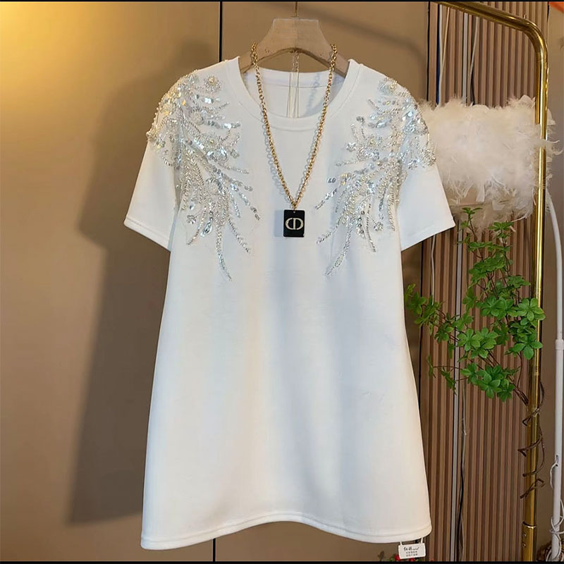 欧韩大码女装2025 春季新款时尚重工亮片钉珠半袖宽松显瘦短袖T恤