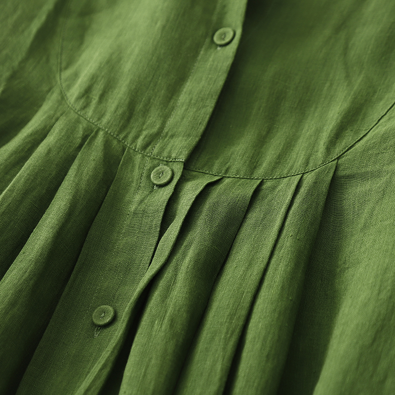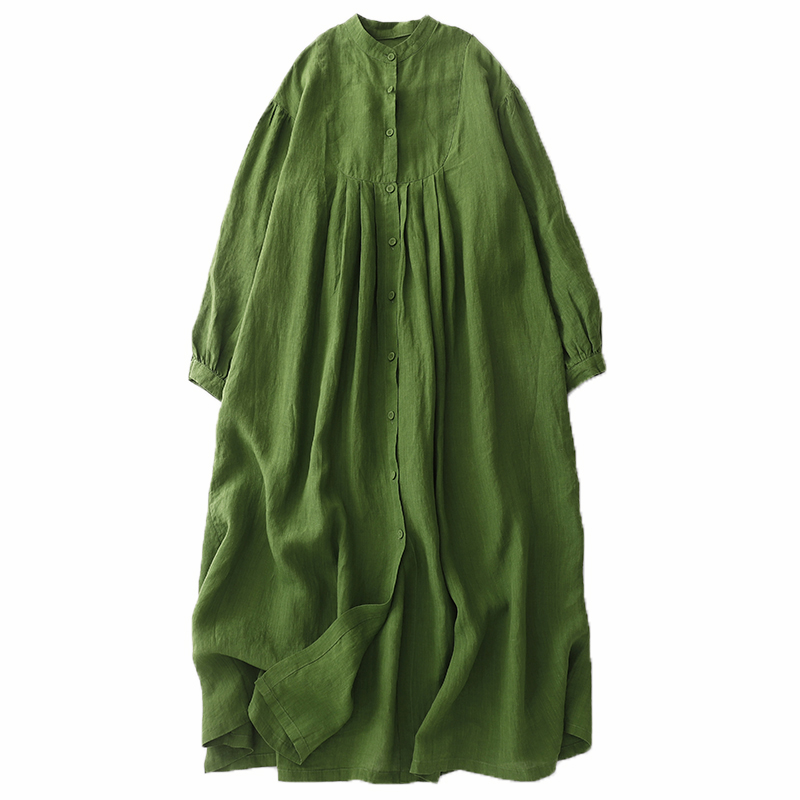 亚麻绿沈色长袖连衣裙女早秋新款文艺气质宽松长袍裙子净色微胖
