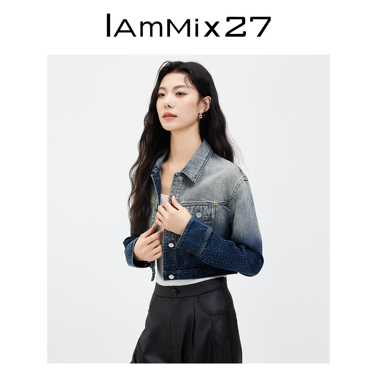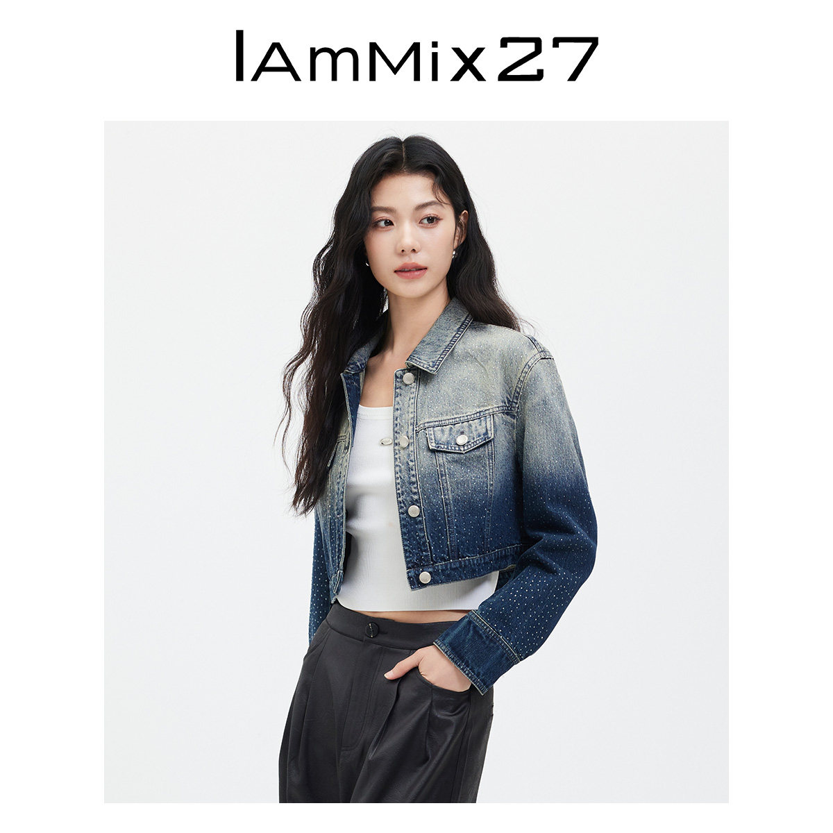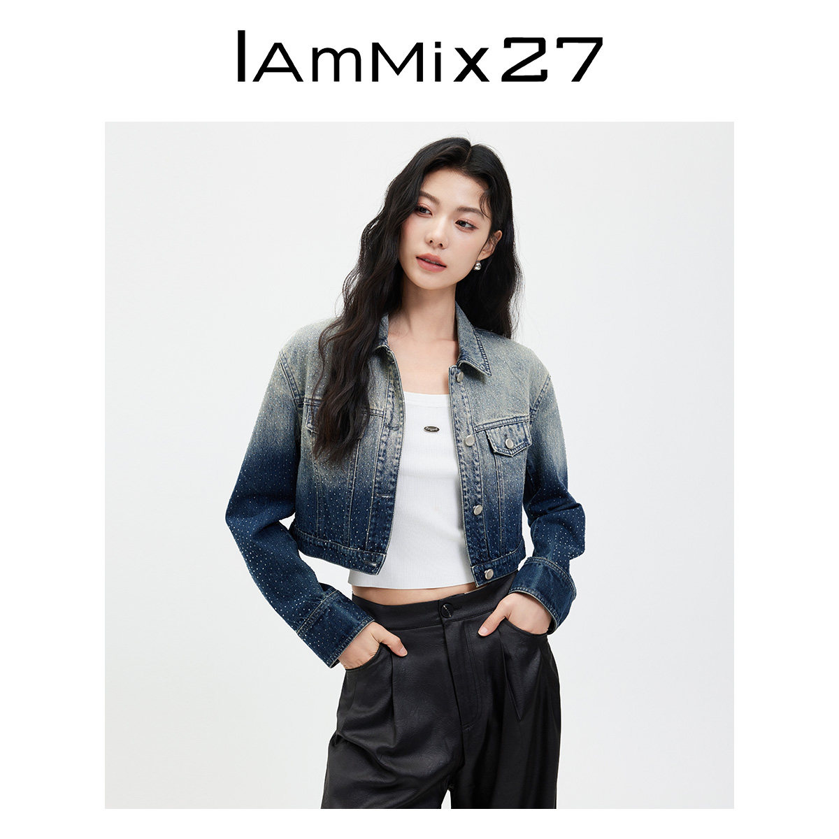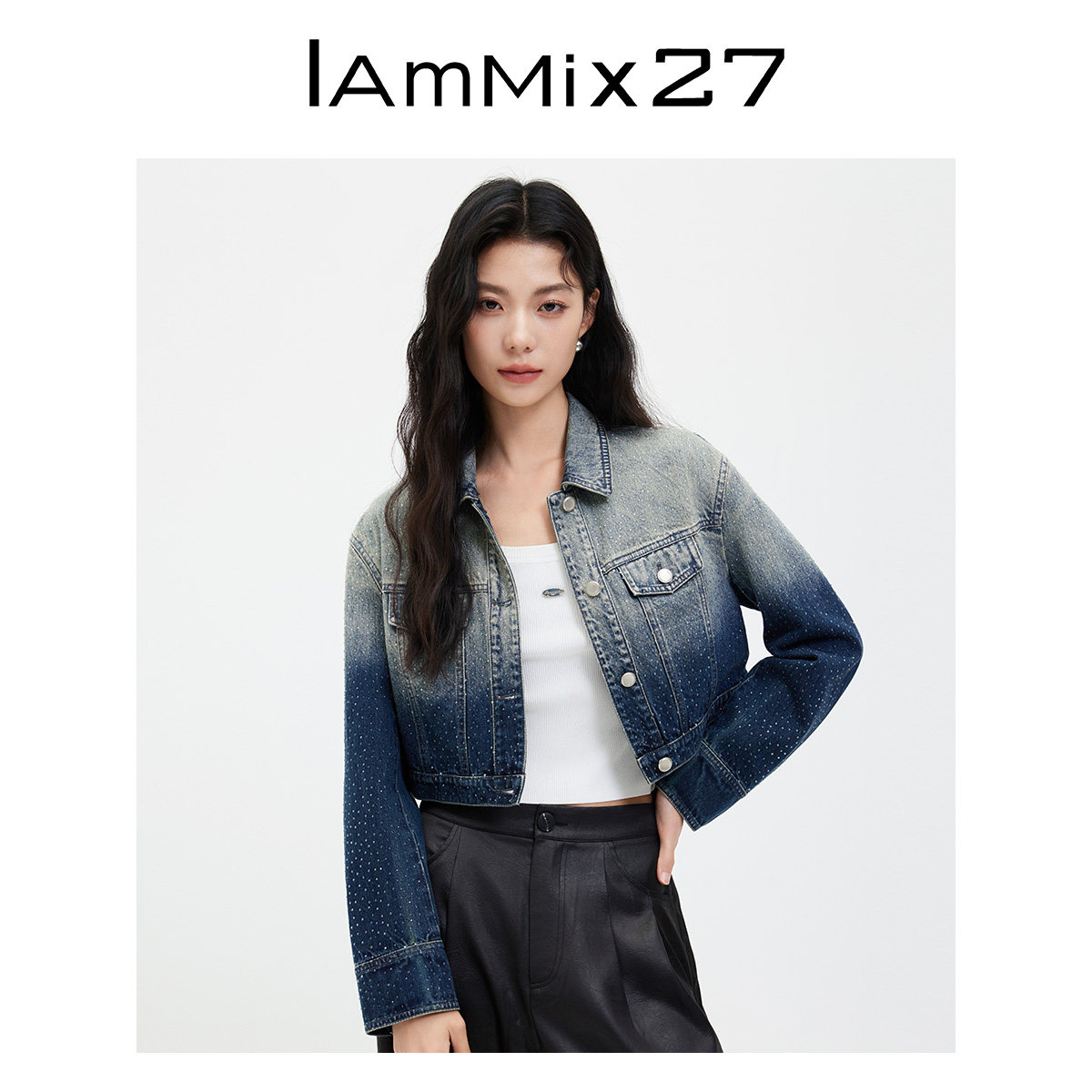 IAmMIX27春秋翻领牛仔外套女短款时尚渐变色百搭高温烫钻牛仔夹克