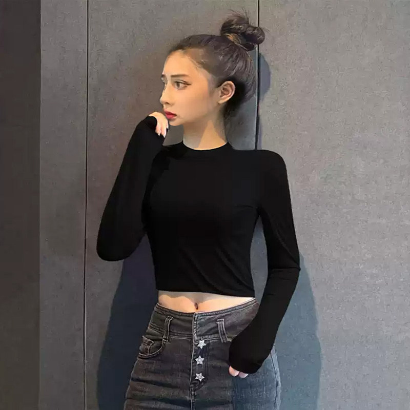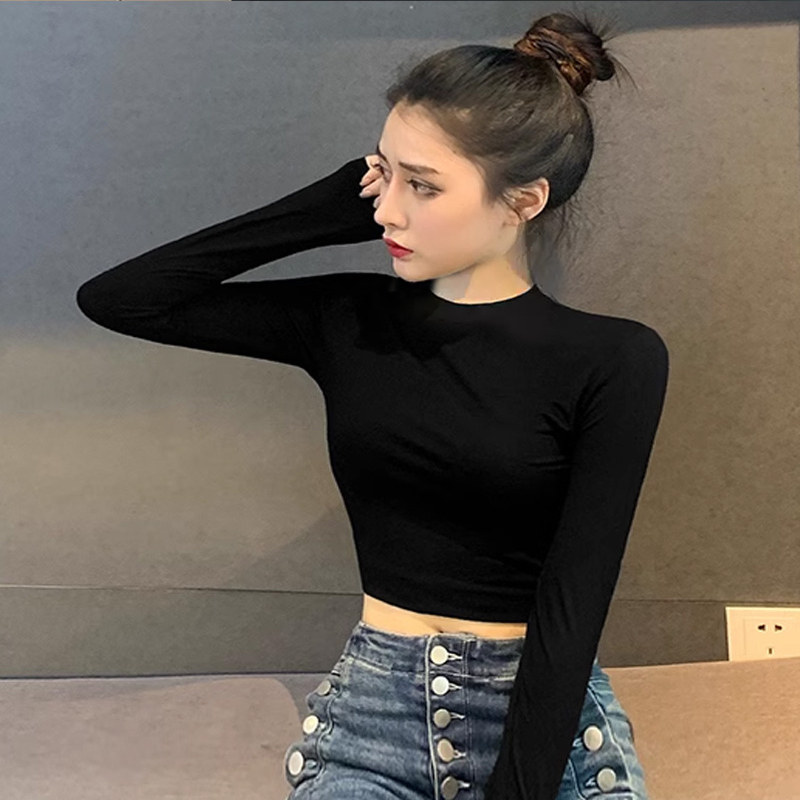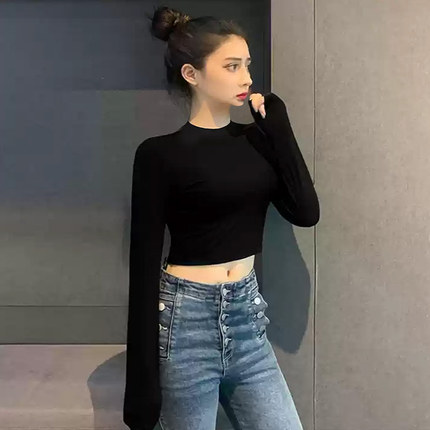 短款露脐长袖T恤女半高领中立领保暖紧身内搭打底衫春秋薄款上衣