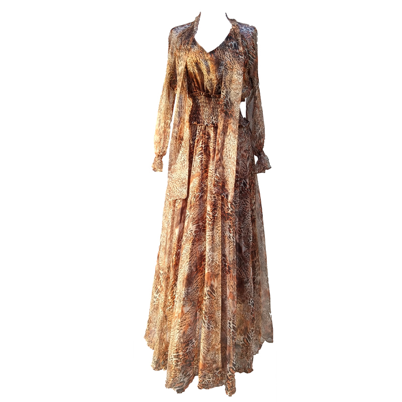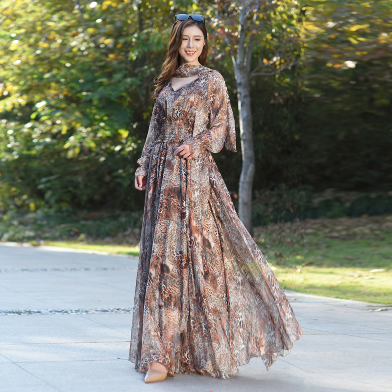 豹纹连衣裙长款过脚踝夏季显瘦雪纺及踝长裙拖地大摆超长沙滩裙