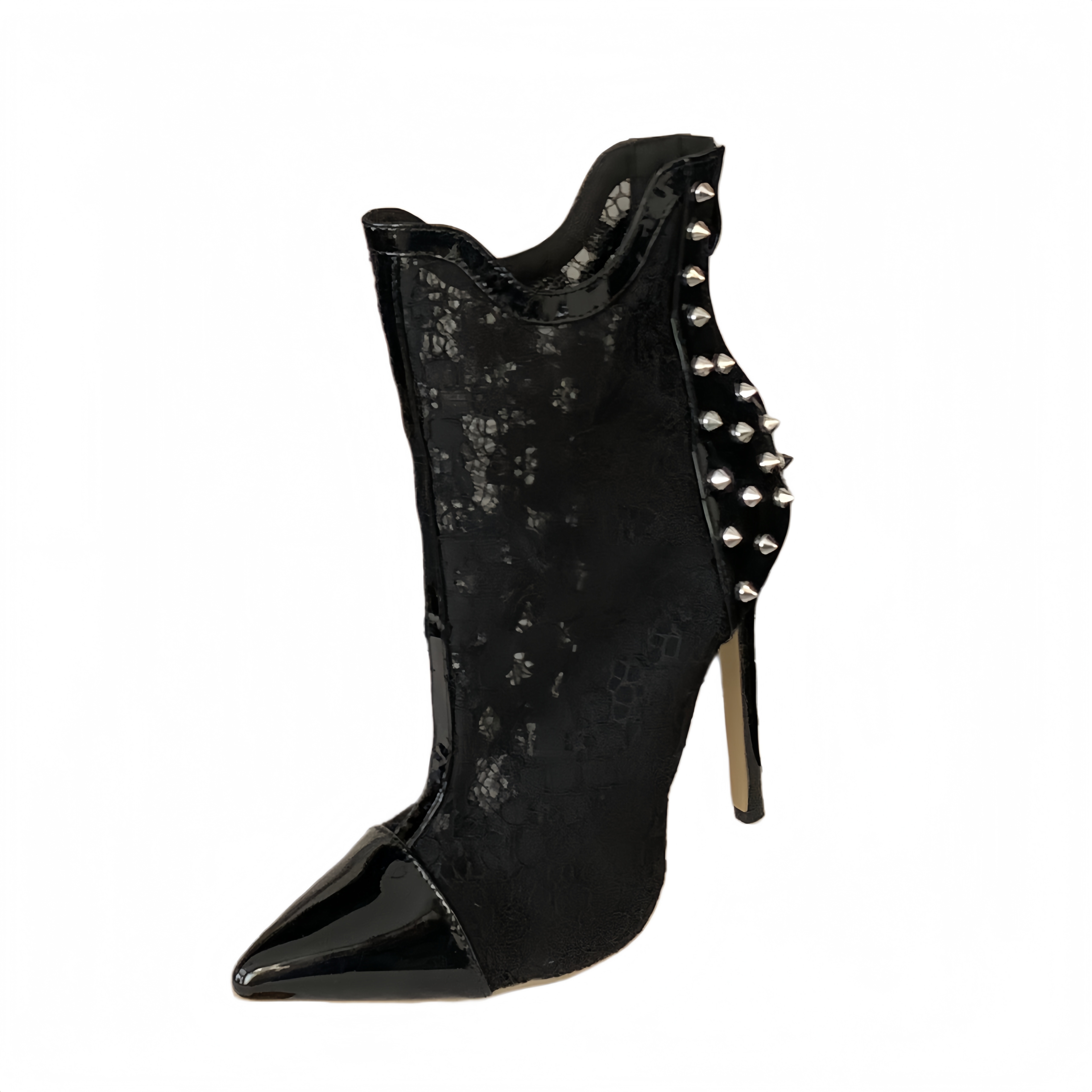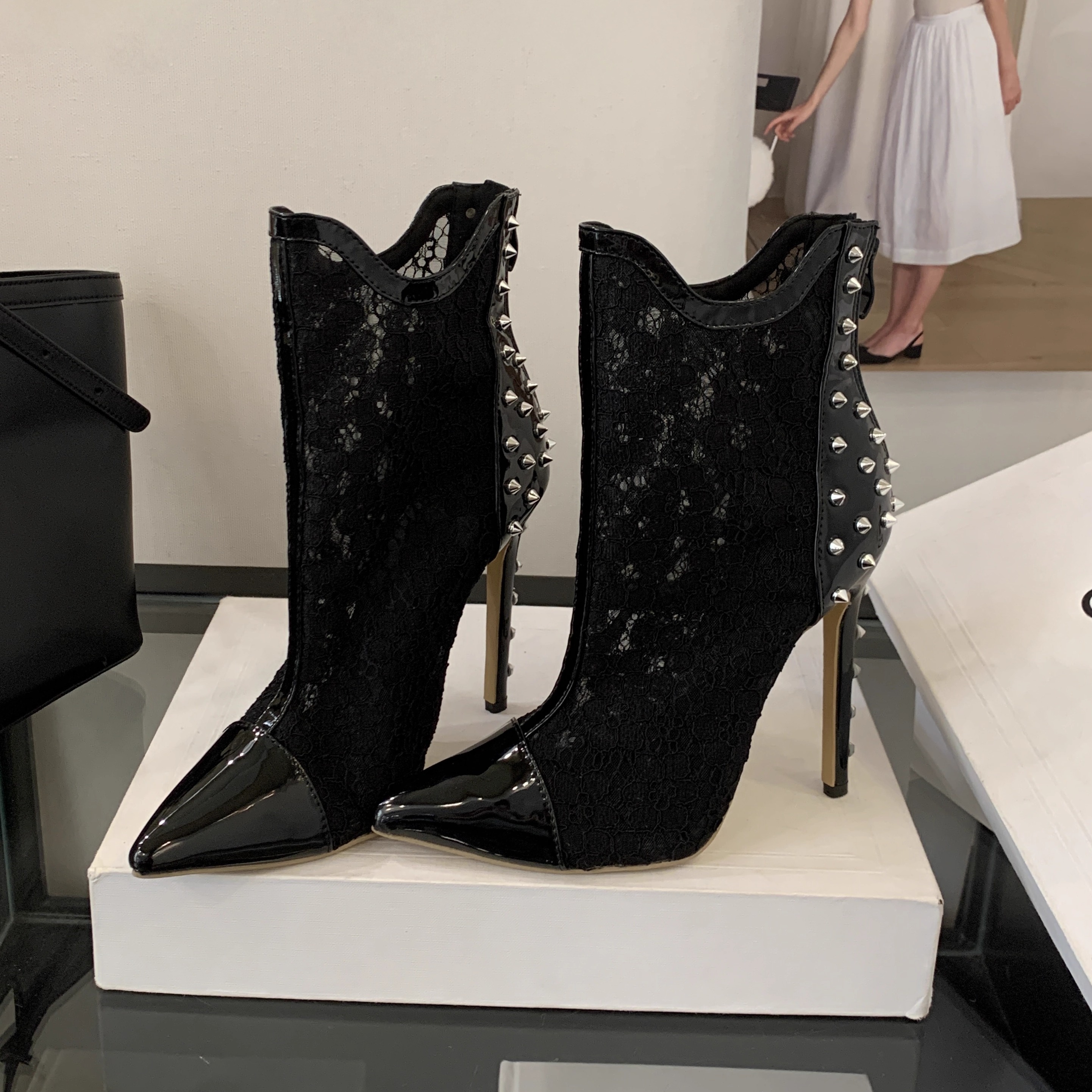 小众设计感时装短靴夏季新款镂空蕾丝透气尖头细跟气质铆钉高跟鞋