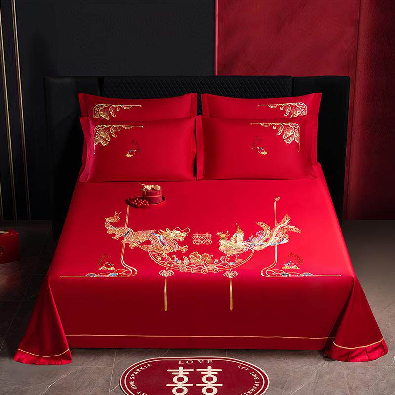 纯棉结婚床单单件女方陪嫁婚庆被单全棉红色三件套龙凤刺绣接亲用