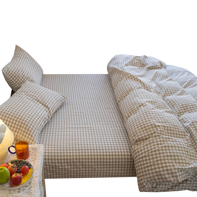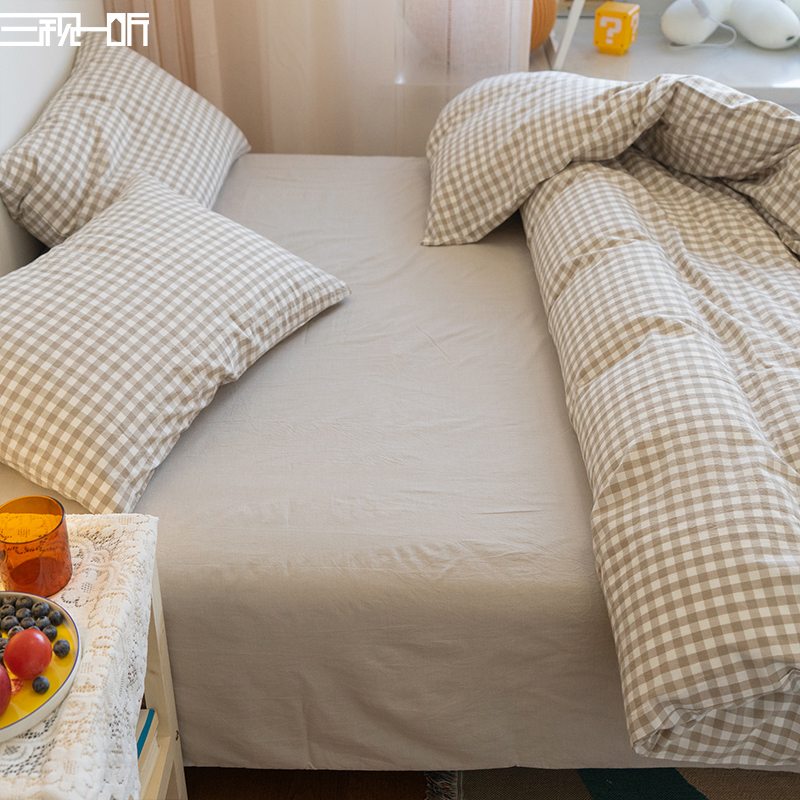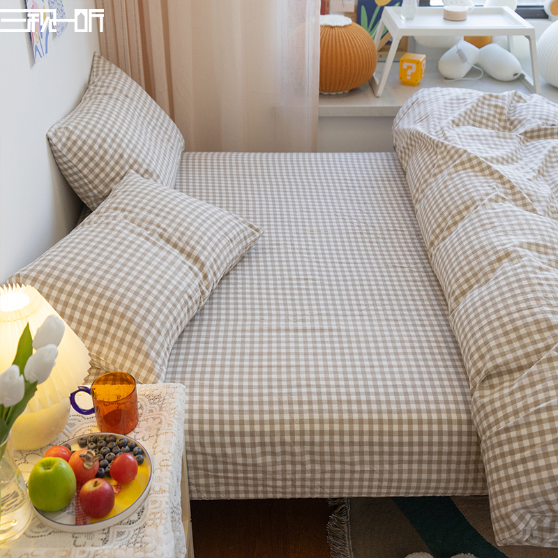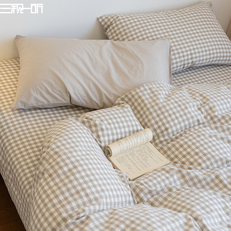 色织无印棉麻质感丨全棉水洗棉四件套纯棉米色格子床上床单三件套
