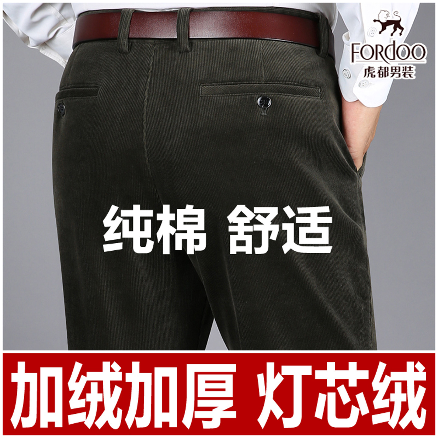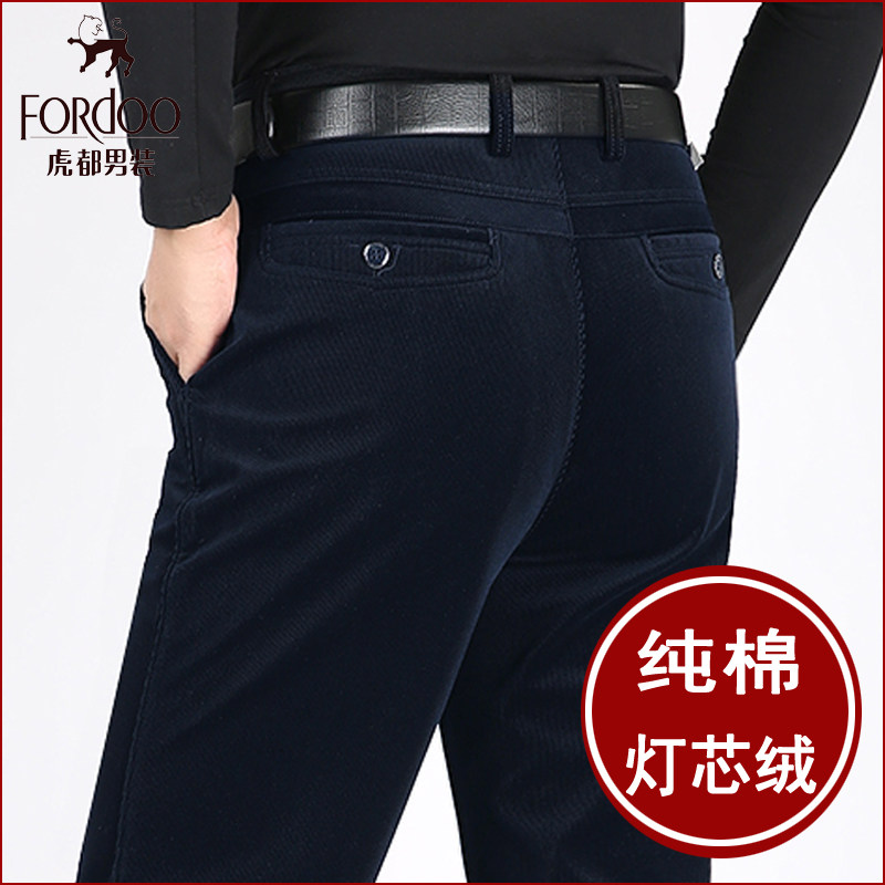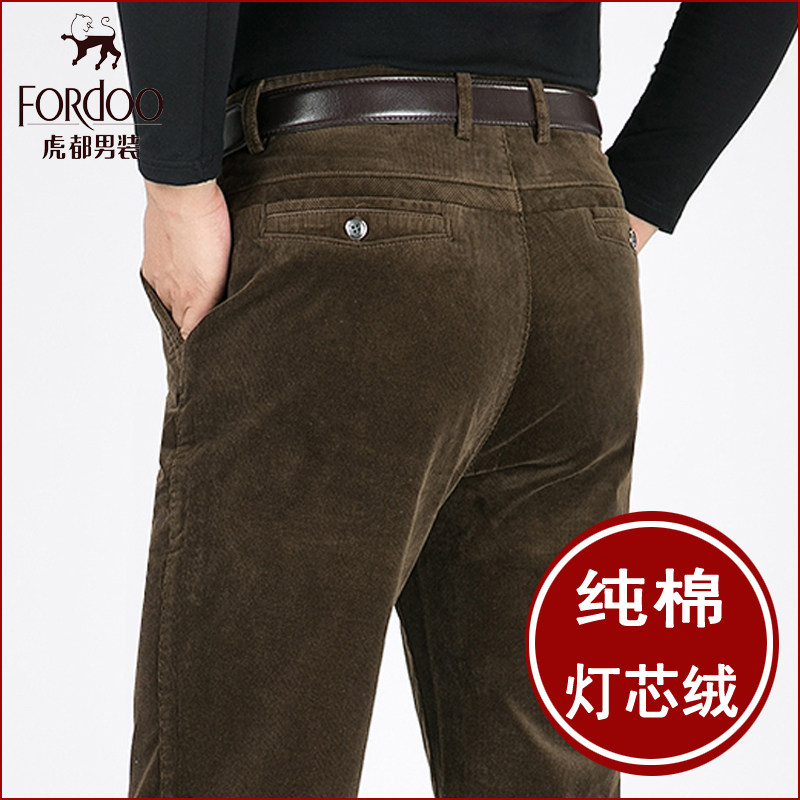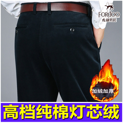 虎都中年纯棉灯芯绒男裤秋冬季直筒弹力加绒加厚男士休闲条绒裤子