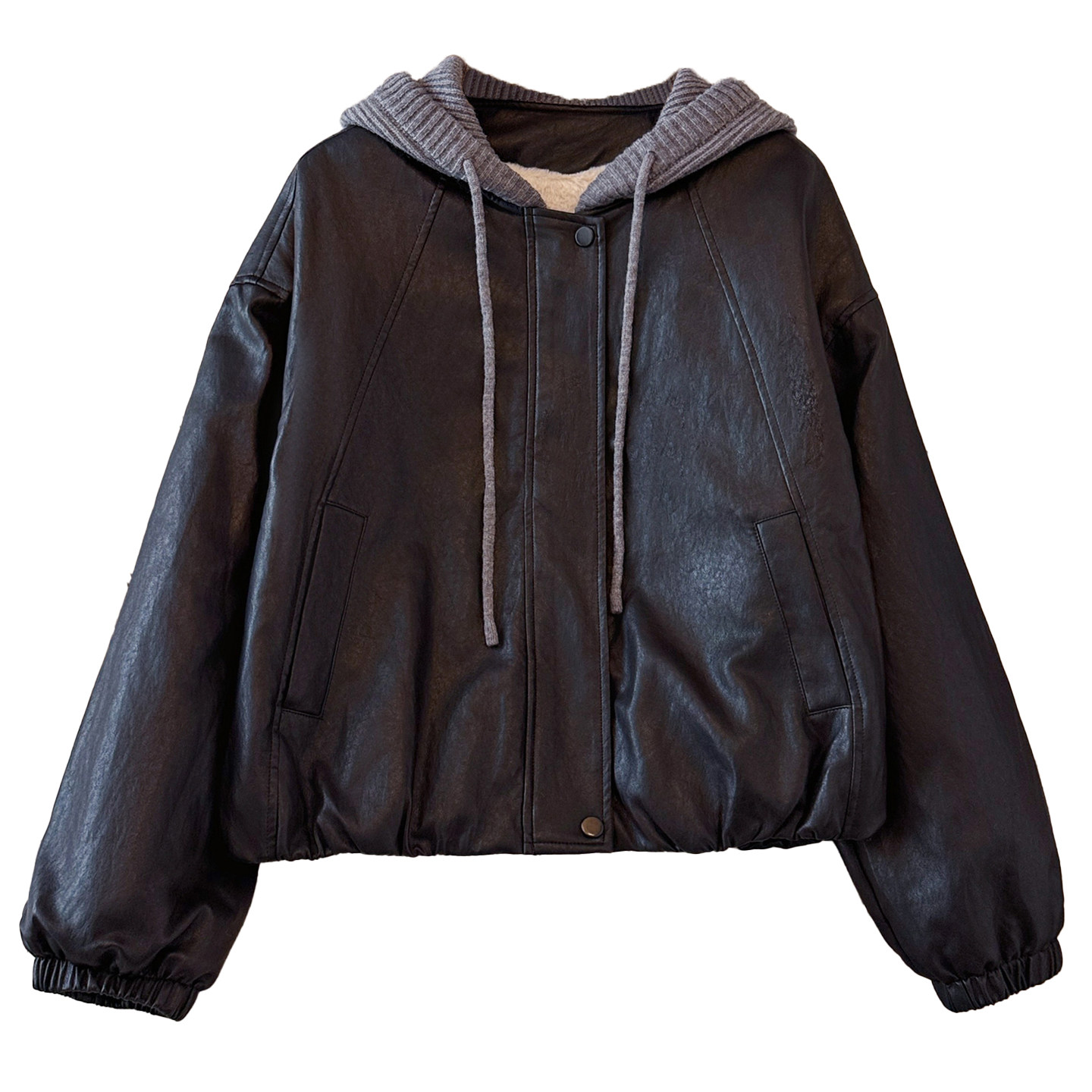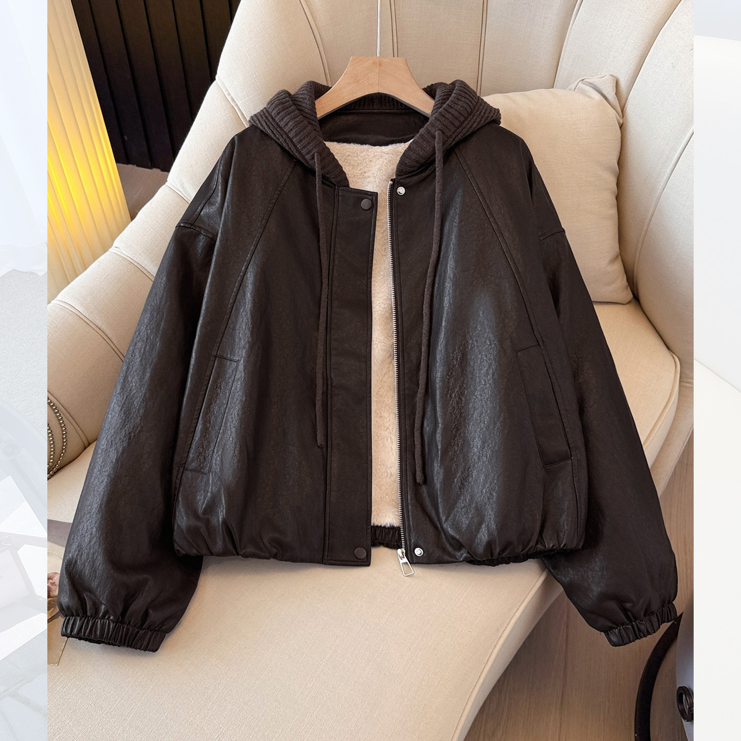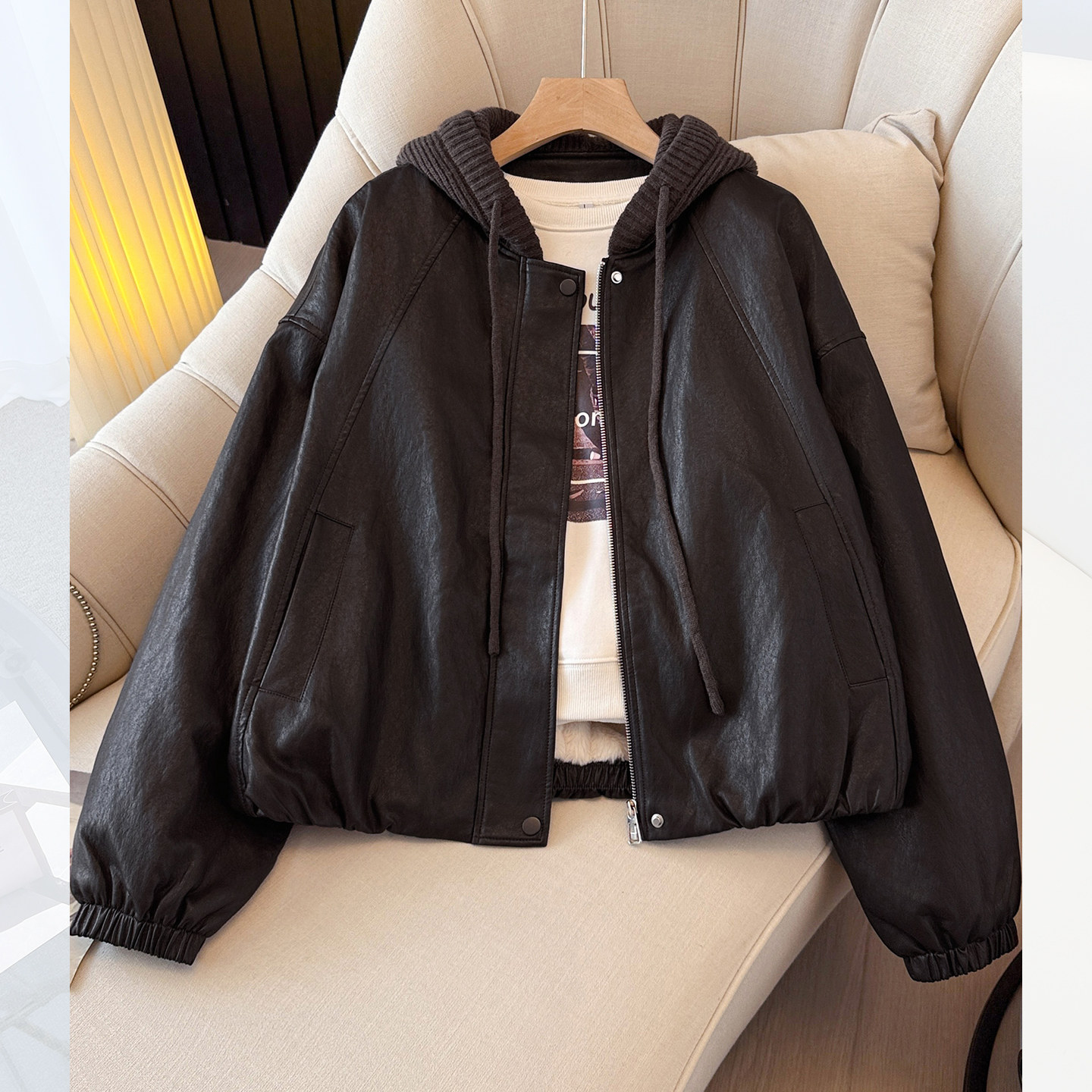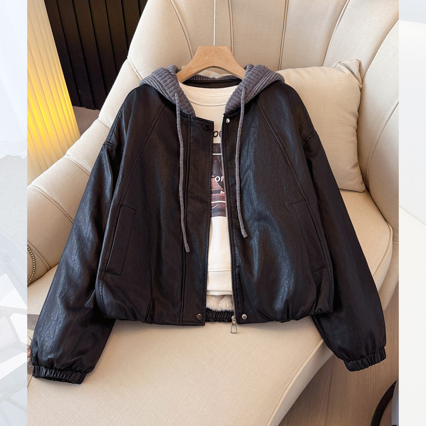 今年流行爆款黑色连帽pu皮衣加绒加厚外套女2025初冬新棒球服夹克