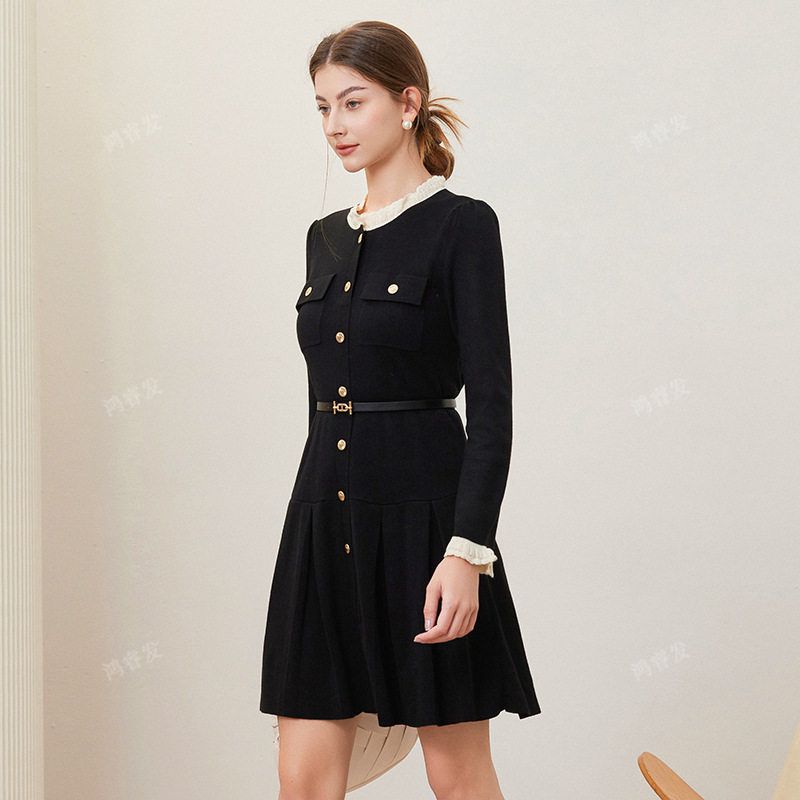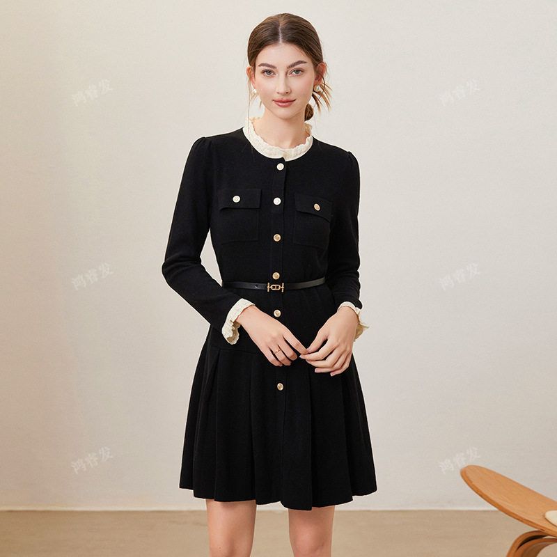 歇香风黑色显瘦减龄高级感针织法式连衣裙长袖圆领茶小众小中长款