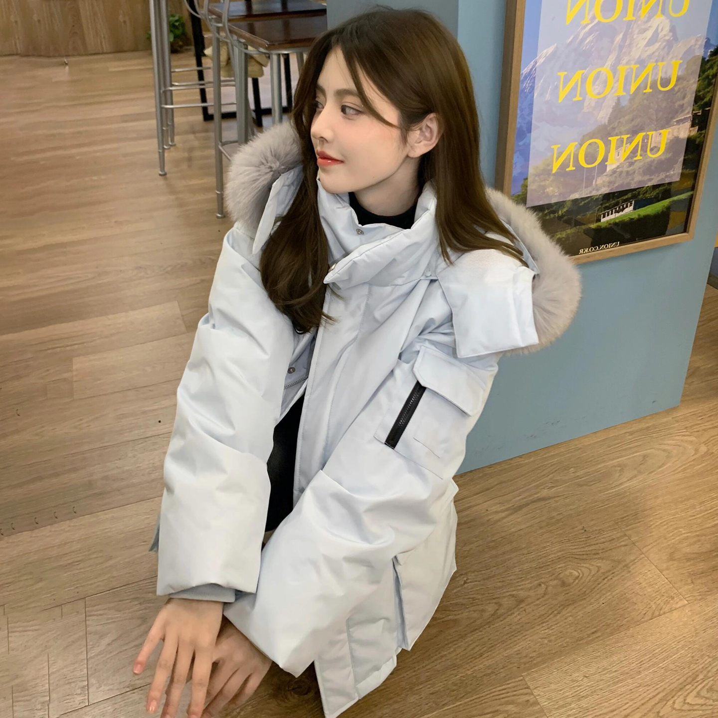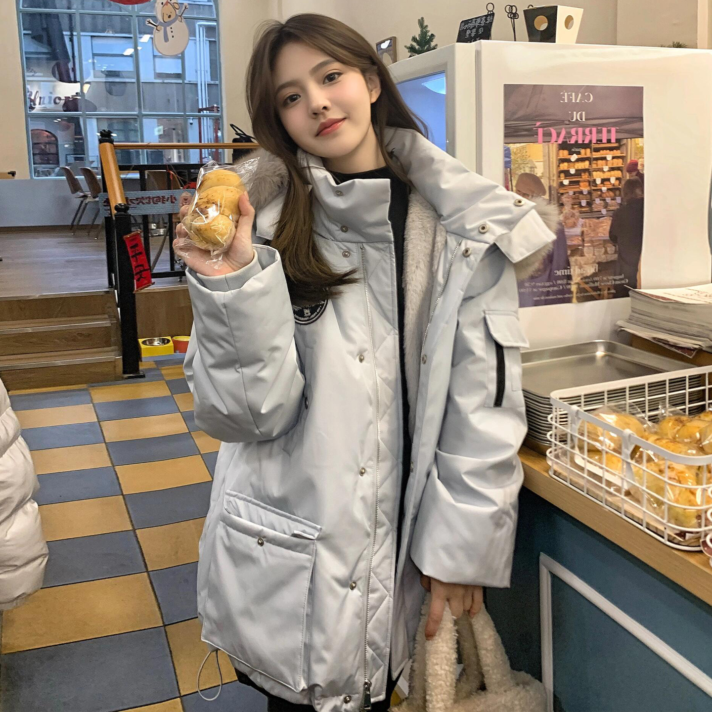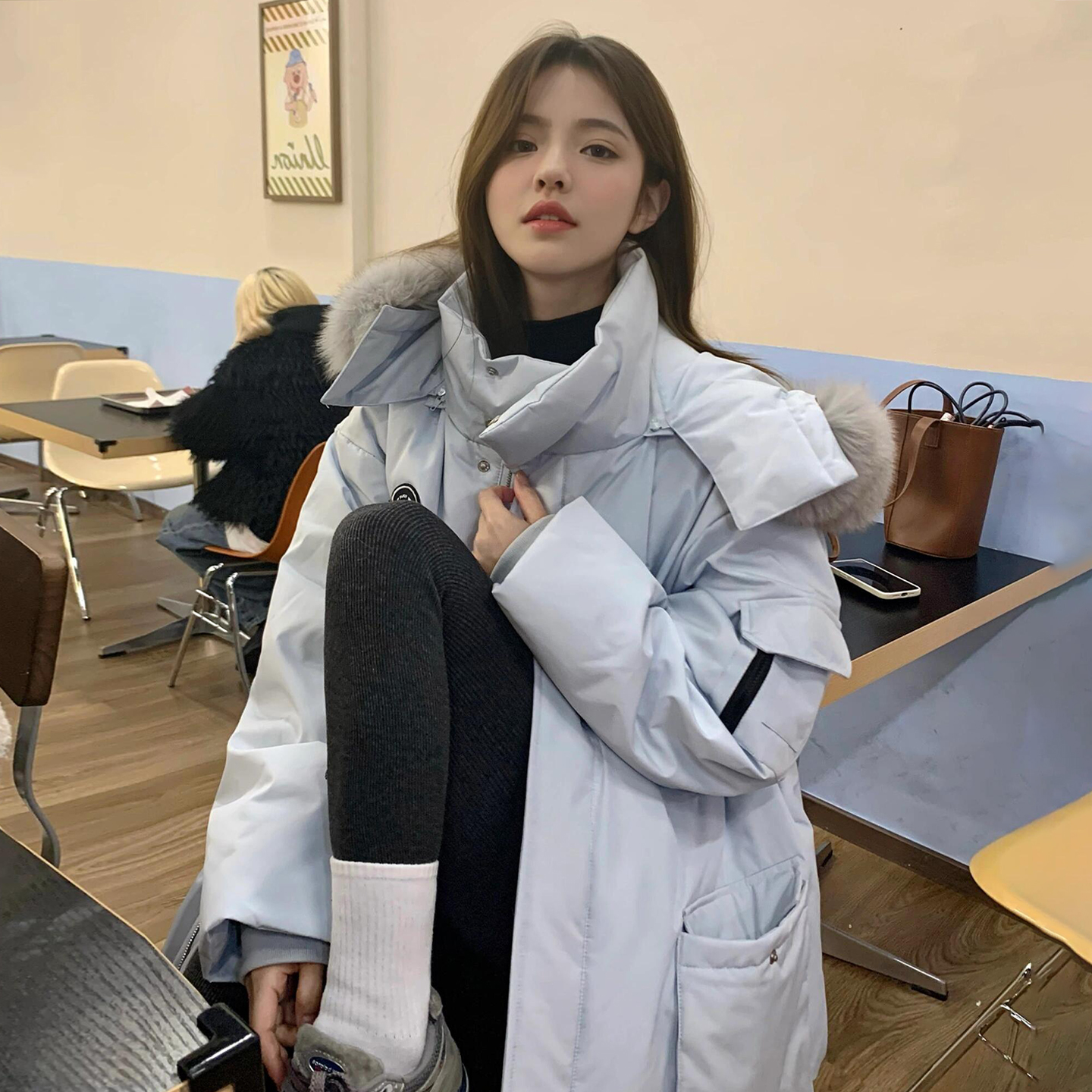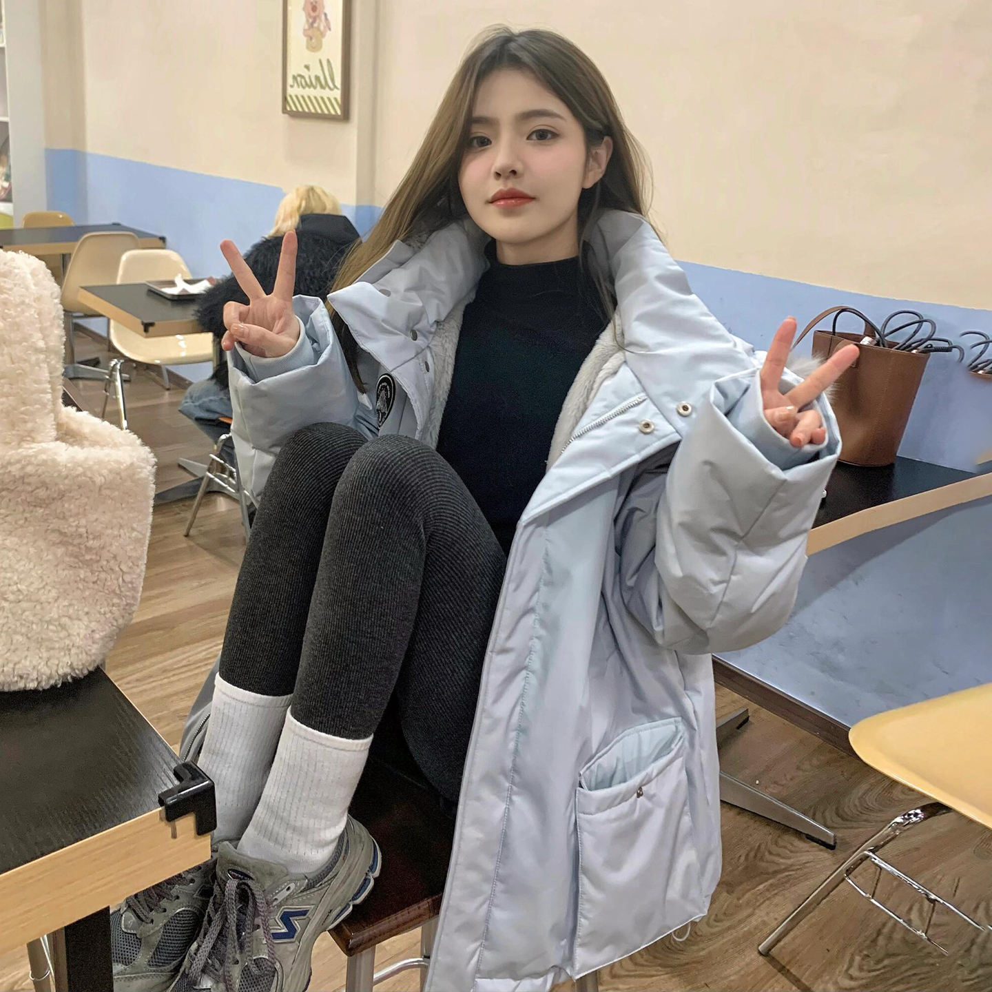 300斤特大码蓝色高级感连帽外套女胖mm秋冬加厚保暖工装棉服上衣